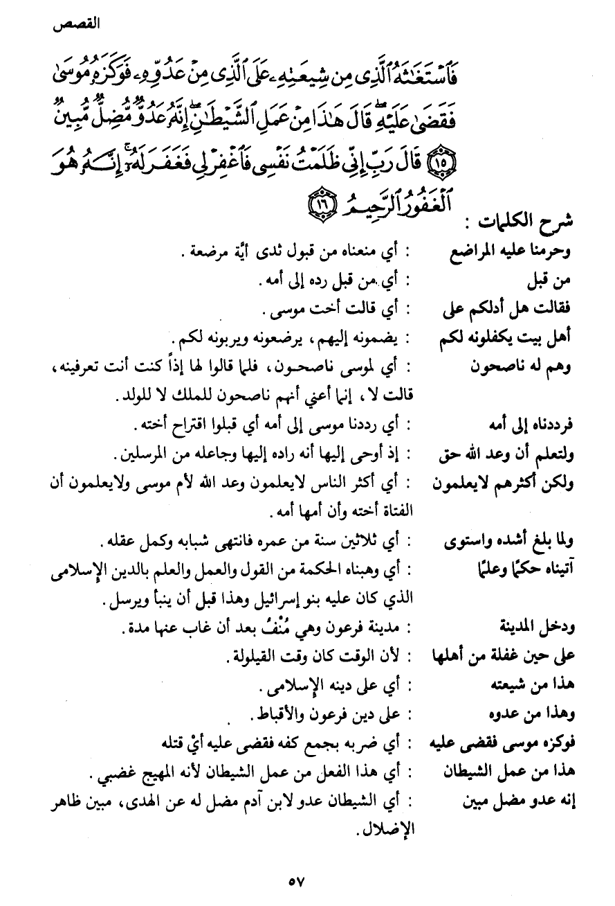 فَاسْتَغَاثَهُ الَّذِي مِنْ شِيعَتِهِ عَلَى الَّذِي مِنْ عَدُوِّهِ فَوَكَزَهُ مُوسَى فَقَضَى عَلَيْهِ قَالَ هَذَا مِنْ عَمَلِ الشَّيْطَانِ إِنَّهُ عَدُوٌّ مُضِلٌّ مُبِينٌ (15) قَالَ رَبِّ إِنِّي ظَلَمْتُ نَفْسِي فَاغْفِرْ لِي فَغَفَرَ لَهُ إِنَّهُ هُوَ الْغَفُورُ الرَّحِيمُ (16)