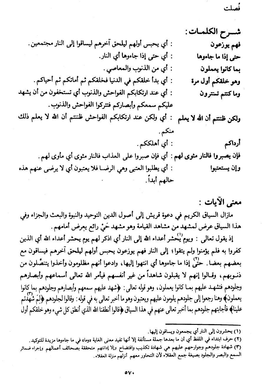 إذ يقول تعالى: {وَيَوْمَ (1) يُحْشَرُ أَعْدَاءُ اللهِ إِلَى النَّارِ} أي اذكر لهم يوم يحشر أعداء الله أي الذين كفروا به فلم يؤمنوا ولم يتقوا؛ إلى النار فهم يوزعون يحبس أولهم ليلحق آخرهم فيساقون مع بعضهم بعضاً. حتى (2) إذا ما جاءوها أي انتهوا إليها، وادعوا أنهم مظلومون وأخذوا يتنصّلون من ذنوبهم، وقالوا إنه لا يقبلون شاهداً من غير أنفسهم فيأمر الله تعالى أسماعهم وأبصارهم وجلودهم فتشهد عليهم بما كانوا يعملون، وهو قوله تعالى: {شَهِدَ عَلَيْهِمْ سَمْعُهُمْ وَأَبْصَارُهُمْ وَجُلُودُهُمْ بِمَا كَانُوا يَعْمَلُونَ} وهنا رجعوا إلى جلودهم يلومون عليهم ويعتبون وهو ما أخبر تعالى به في قوله: {وَقَالُوا لِجُلُودِهِمْ لِمَ شَهِدْتُمْ (3) عَلَيْنَا} فأجابتهم جلودهم بما أخبر تعالى عنهم في هذا السياق {قَالُوا أَنْطَقَنَا اللهُ الَّذِي أَنْطَقَ كُلَّ شَيْءٍ وَهُوَ خَلَقَكُمْ أَوَّلَ