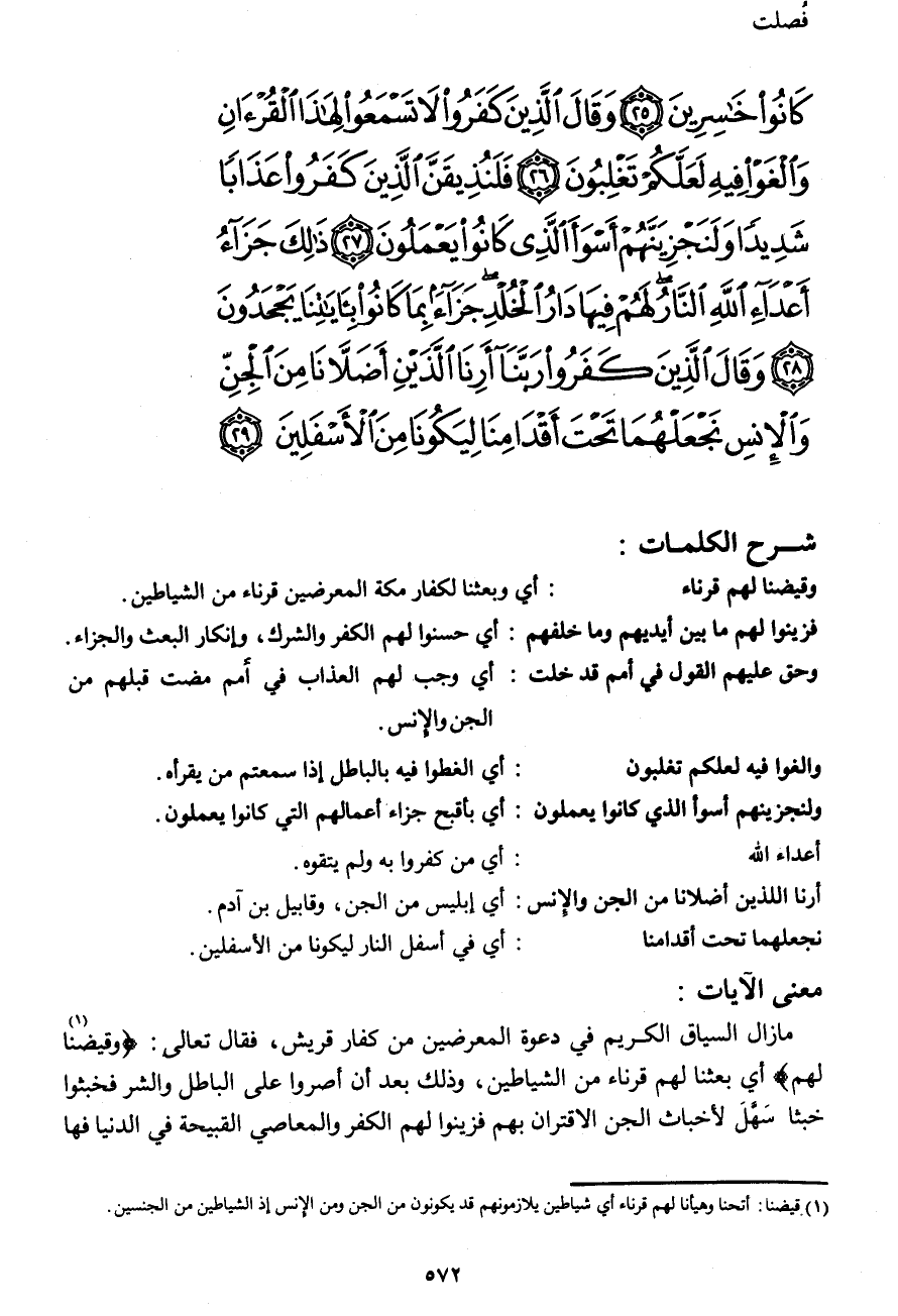 كَانُوا خَاسِرِينَ (25) وَقَالَ الَّذِينَ كَفَرُوا لا تَسْمَعُوا لِهَذَا الْقُرْآنِ وَالْغَوْا فِيهِ لَعَلَّكُمْ تَغْلِبُونَ (26) فَلَنُذِيقَنَّ الَّذِينَ كَفَرُوا عَذَاباً شَدِيداً وَلَنَجْزِيَنَّهُمْ أَسْوَأَ الَّذِي كَانُوا يَعْمَلُونَ (27) ذَلِكَ جَزَاءُ أَعْدَاءِ اللهِ النَّارُ لَهُمْ فِيهَا دَارُ الْخُلْدِ جَزَاءً بِمَا كَانُوا بِآياتِنَا يَجْحَدُونَ (28) وَقَالَ الَّذِينَ كَفَرُوا رَبَّنَا أَرِنَا الَّذَيْنِ أَضَلَّانَا مِنَ الْجِنِّ وَالْأِنْسِ نَجْعَلْهُمَا تَحْتَ أَقْدَامِنَا لِيَكُونَا مِنَ الْأَسْفَلِينَ (29)