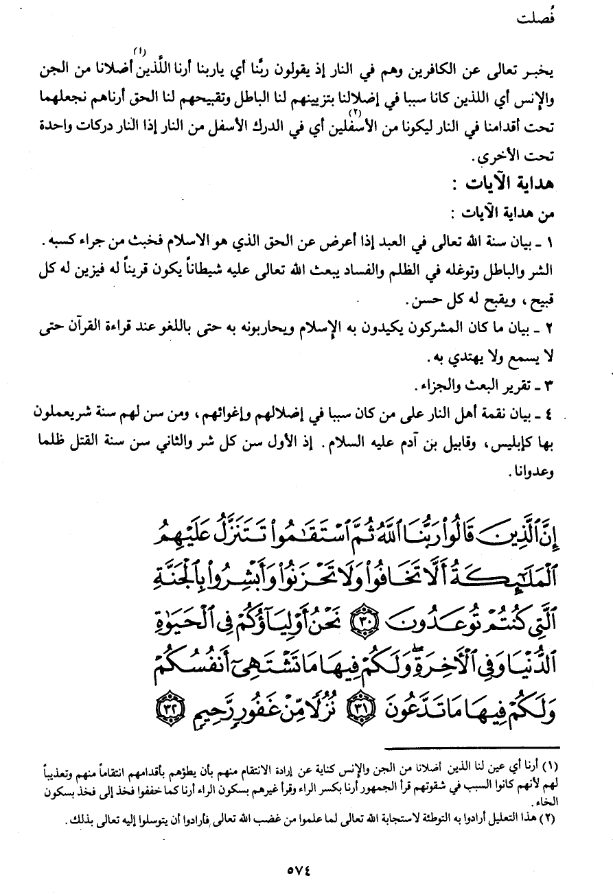 إِنَّ الَّذِينَ قَالُوا رَبُّنَا اللهُ ثُمَّ اسْتَقَامُوا تَتَنَزَّلُ عَلَيْهِمُ الْمَلائِكَةُ أَلَّا تَخَافُوا وَلا تَحْزَنُوا وَأَبْشِرُوا بِالْجَنَّةِ الَّتِي كُنْتُمْ تُوعَدُونَ (30) نَحْنُ أَوْلِيَاؤُكُمْ فِي الْحَيَاةِ الدُّنْيَا وَفِي الْآخِرَةِ وَلَكُمْ فِيهَا مَا تَشْتَهِي أَنْفُسُكُمْ وَلَكُمْ فِيهَا مَا تَدَّعُونَ (31) نُزُلاً مِنْ غَفُورٍ رَحِيمٍ (32)