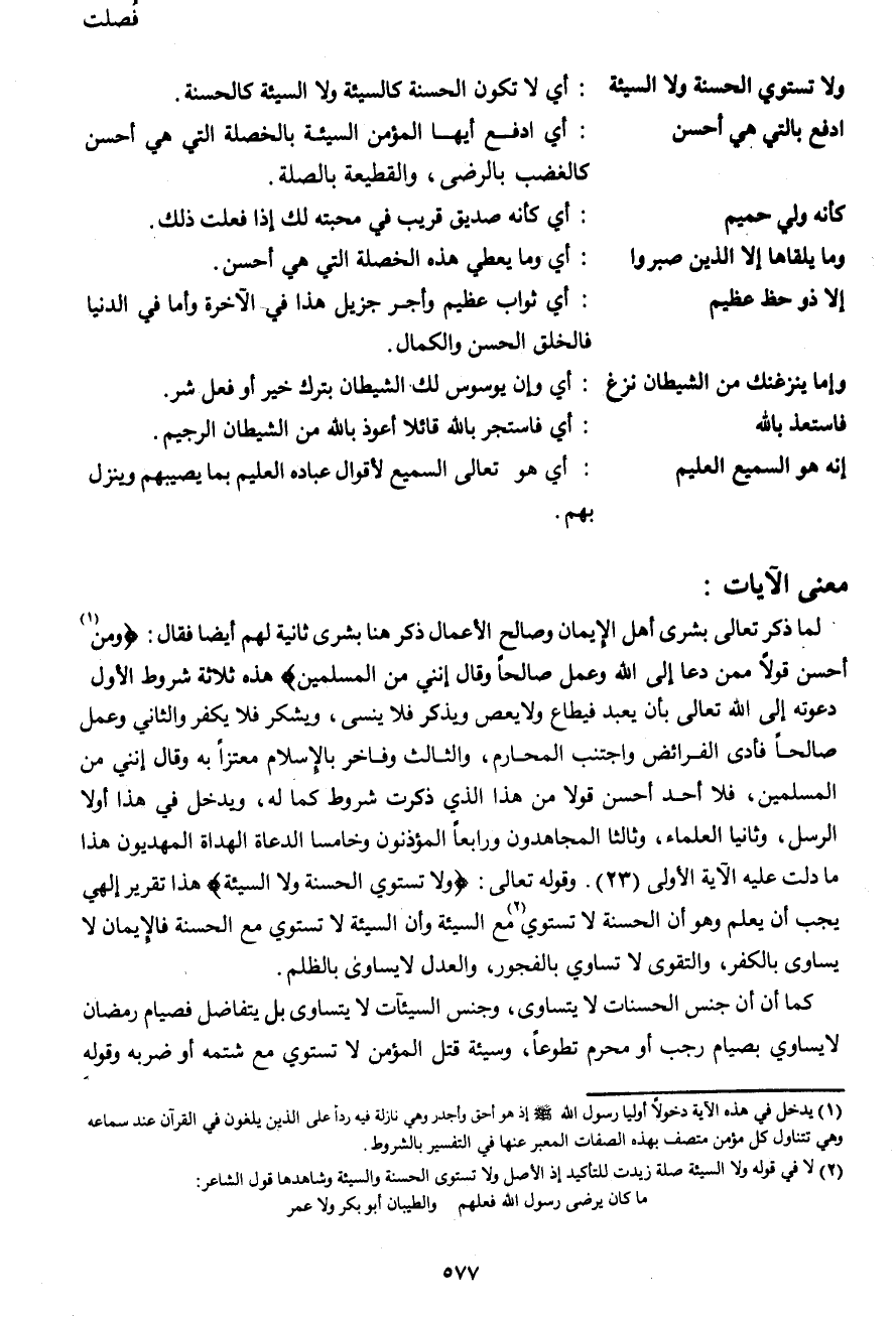 لما ذكر تعالى بشرى أهل الإيمان وصالح الأعمال ذكر هنا بشرى ثانية لهم أيضاً فقال: {وَمَنْ (1) أَحْسَنُ قَوْلاً مِمَّنْ دَعَا إِلَى اللهِ وَعَمِلَ صَالِحاً وَقَالَ إِنَّنِي مِنَ الْمُسْلِمِينَ} هذه ثلاثة شروط الأول دعوته إلى الله تعالى بأن يعبد فيطاع ولا يعص ويذكر ولا ينسى، ويشكر ولا يكفر والثاني وعمل صالحاً فأدى الفرائض واجتنب المحارم، والثالث وفاخر بالإسلام معتزا به وقال إنني من المسلمين، فلا أحد أحسن قولاً من هذا الذي ذكرت شروط كماله، ويدخل في هذا أولا الرسل، وثانياً العلماء، وثالثاً المجاهدون ورابعاً المؤذنون وخامساً الدعاة الهداة المهديون هذا ما دلت عليه الآية الأولى (23) . وقوله تعالى: {وَلا تَسْتَوِي الْحَسَنَةُ وَلا السَّيِّئَةُ} هذا تقرير إلهي يجب أن يعلم وهو أن الحسنة لا تستوي (2) مع السيئة وأن السيئة لا تستوي مع الحسنة فالإيمان لا يساوى بالكفر، والتقوى لا يساوى بالفجور، والعدل لا يساوى بالظلم.