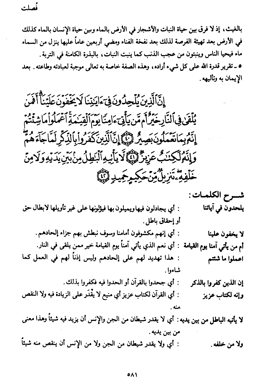 إِنَّ الَّذِينَ يُلْحِدُونَ فِي آيَاتِنَا لا يَخْفَوْنَ عَلَيْنَا أَفَمَنْ يُلْقَى فِي النَّارِ خَيْرٌ أَمَّنْ يَأْتِي آمِناً يَوْمَ الْقِيَامَةِ اعْمَلُوا مَا شِئْتُمْ إِنَّهُ بِمَا تَعْمَلُونَ بَصِيرٌ (40) إِنَّ الَّذِينَ كَفَرُوا بِالذِّكْرِ لَمَّا جَاءَهُمْ وَإِنَّهُ لَكِتَابٌ عَزِيزٌ (41) لا يَأْتِيهِ الْبَاطِلُ مِنْ بَيْنِ يَدَيْهِ وَلا مِنْ خَلْفِهِ تَنْزِيلٌ مِنْ حَكِيمٍ حَمِيدٍ (42)