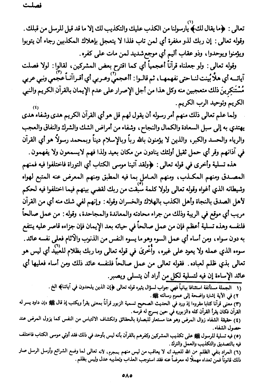 هذه تسلية وأخرى في قوله تعالى: {وَلَقَدْ آتَيْنَا مُوسَى الْكِتَابَ} أي التوراة فاختلفوا فيه فمنهم المصدق ومنهم المكذب، ومنهم العامل بما فيه المطبق ومنهم المعرض عنه المتبع لهواه وشيطانه الذي أغواه وقوله تعالى {وَلَوْلا كَلِمَةٌ سَبَقَتْ (5) مِنْ رَبِّكَ لَقُضِيَ بَيْنَهُمْ} فيما اختلفوا فيه لحكم لأهل الصدق بالنجاة وأهل الكذب بالهلاك والخسران وقوله: إنهم لفي شك منه أي من القرآن مريب أي موقع في الريبة وذلك من جراء محادته والمعاندة والمجاحدة، وقوله: {مَنْ عَمِلَ صَالِحاً فَلِنَفْسِهِ} وهذه تسلية أعظم فإن من عمل صالحاً في حياته بعد الإيمان فإن جزاءه قاصر عليه ينتفع به دون سواه، ومن أساء أي عمل السوء وهو ما يسوء النفس من الذنوب والآثام فعلى نفسه عائد سوءه الذي عمله ولا يعود على غيره، وأخرى في قوله تعالى وما ربك بظلام للعبيد (6) أي ليس هو تعالى بذي ظلم لعباده. فقوله تعالى من عمل صالحاً فلنفسه عائد ذلك ومن أساء فعليها أي عائد الإساءة إن فيه لتسلية لكل من أراد أن يتسلى ويصبر.