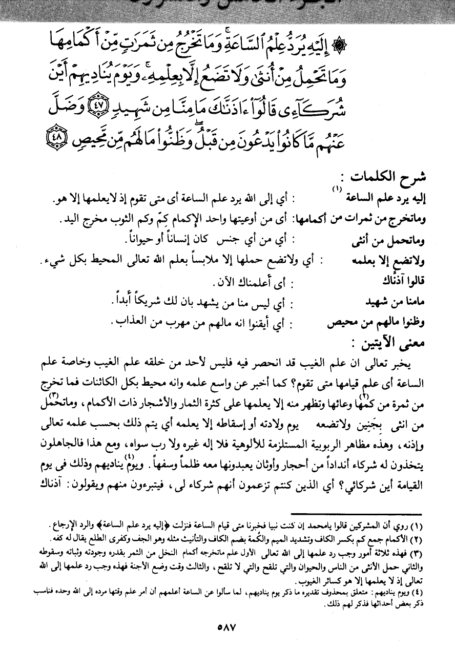 إِلَيْهِ يُرَدُّ عِلْمُ السَّاعَةِ وَمَا تَخْرُجُ مِنْ ثَمَرَاتٍ مِنْ أَكْمَامِهَا وَمَا تَحْمِلُ مِنْ أُنْثَى وَلا تَضَعُ إِلَّا بِعِلْمِهِ وَيَوْمَ يُنَادِيهِمْ أَيْنَ شُرَكَائِي قَالُوا آذَنَّاكَ مَا مِنَّا مِنْ شَهِيدٍ (47) وَضَلَّ عَنْهُمْ مَا كَانُوا يَدْعُونَ مِنْ قَبْلُ وَظَنُّوا مَا لَهُمْ مِنْ مَحِيصٍ (48)
