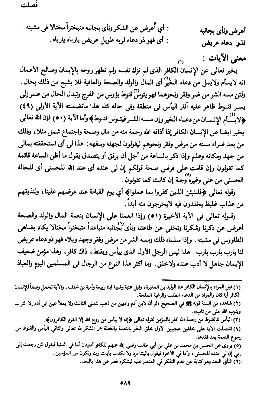 وقوله تعالى في الآية الأخيرة (51) {وَإِذَا أَنْعَمْنَا عَلَى الْأِنْسَانِ} بنعمة المال والولد والصحة أعرض عن ذكرنا وشكرنا وتخلى عن طاعتنا ونأى (6) بجانبه متباعداً متبختراً مختالاً يكاد يضاهي الطاووس في مشيته. وإذا سلبناه ذلك ومسه الشر من مرض وفقر وجهد وبلاء فهو ذو دعاء عريض لنا يا رب يا رب يا رب. هذا ليس الرجل الأول الذي ييأس ويقنط، ذاك كافر، وهذا مؤمن ضعيف الإيمان جاهل لا أدب عنده ولا خلق. وما أكثر هذا النوع من الرجال في المسلمين اليوم والعياذ