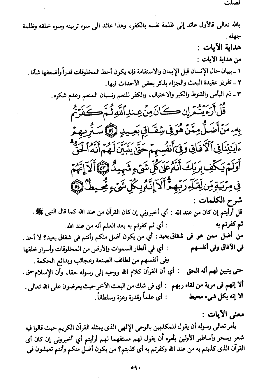قُلْ أَرَأَيْتُمْ إِنْ كَانَ مِنْ عِنْدِ اللهِ ثُمَّ كَفَرْتُمْ بِهِ مَنْ أَضَلُّ مِمَّنْ هُوَ فِي شِقَاقٍ بَعِيدٍ (52) سَنُرِيهِمْ آيَاتِنَا فِي الْآفَاقِ وَفِي أَنْفُسِهِمْ حَتَّى يَتَبَيَّنَ لَهُمْ أَنَّهُ الْحَقُّ أَوَلَمْ يَكْفِ بِرَبِّكَ أَنَّهُ عَلَى كُلِّ شَيْءٍ شَهِيدٌ (53) أَلا إِنَّهُمْ فِي مِرْيَةٍ مِنْ لِقَاءِ رَبِّهِمْ أَلا إِنَّهُ بِكُلِّ شَيْءٍ مُحِيطٌ (54)