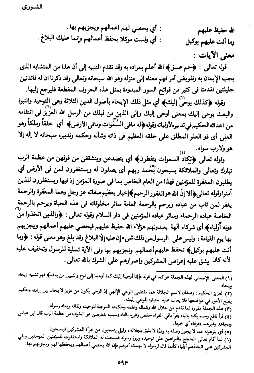 وقوله تعالى {تَكَادُ (4) السَّمَاوَاتُ يَتَفَطَّرْنَ} أي يتصدعن ويتشققن من فوقهن من عظمة الرب تبارك وتعالى والملائكة يسبحون بحمد (5) ربهم أي يصلون له ويستغفرون لمن في الأرض أي يطلبون المغفرة للمؤمنين فهذا من العام الخاص بما في سورة المؤمن إذ فيها ويستغفرون للذين آمنوا وقوله تعالى {أَلا إِنَّ اللهَ هُوَ الْغَفُورُ الرَّحِيمُ} إخبار بعظيم صفاته عز وجل وهما المغفرة والرحمة يغفر لمن تاب من عباده ويرحم بالرحمة العامة سائر مخلوقاته في هذه الحياة ويرحم بالرحمة الخاصة عباده الرحماء وسائر عباده المؤمنين في دار السلام وقوله تعالى: {وَالَّذِينَ اتَّخَذُوا (6) مِنْ دُونِهِ أَوْلِيَاءَ} أي شركاء آلهة يعبدونهم هؤلاء الله حفيظ عليهم فيحصي عليهم أعمالهم ويجزيهم بها يوم القيامة، وليس على الرسول من ذلك شيء إن عليه إلا البلاغ وقد بلغ وهو معنى قوله: {وَمَا أَنْتَ عَلَيْهِمْ بِوَكِيلٍ} تحفظ عليهم أعمالهم وتجزيهم بها وفي الآية تسلية للرسول وتخفيف عليه لأنه كان يشق عليه إعراض المشركين وإصرارهم على الشرك بالله تعالى.
