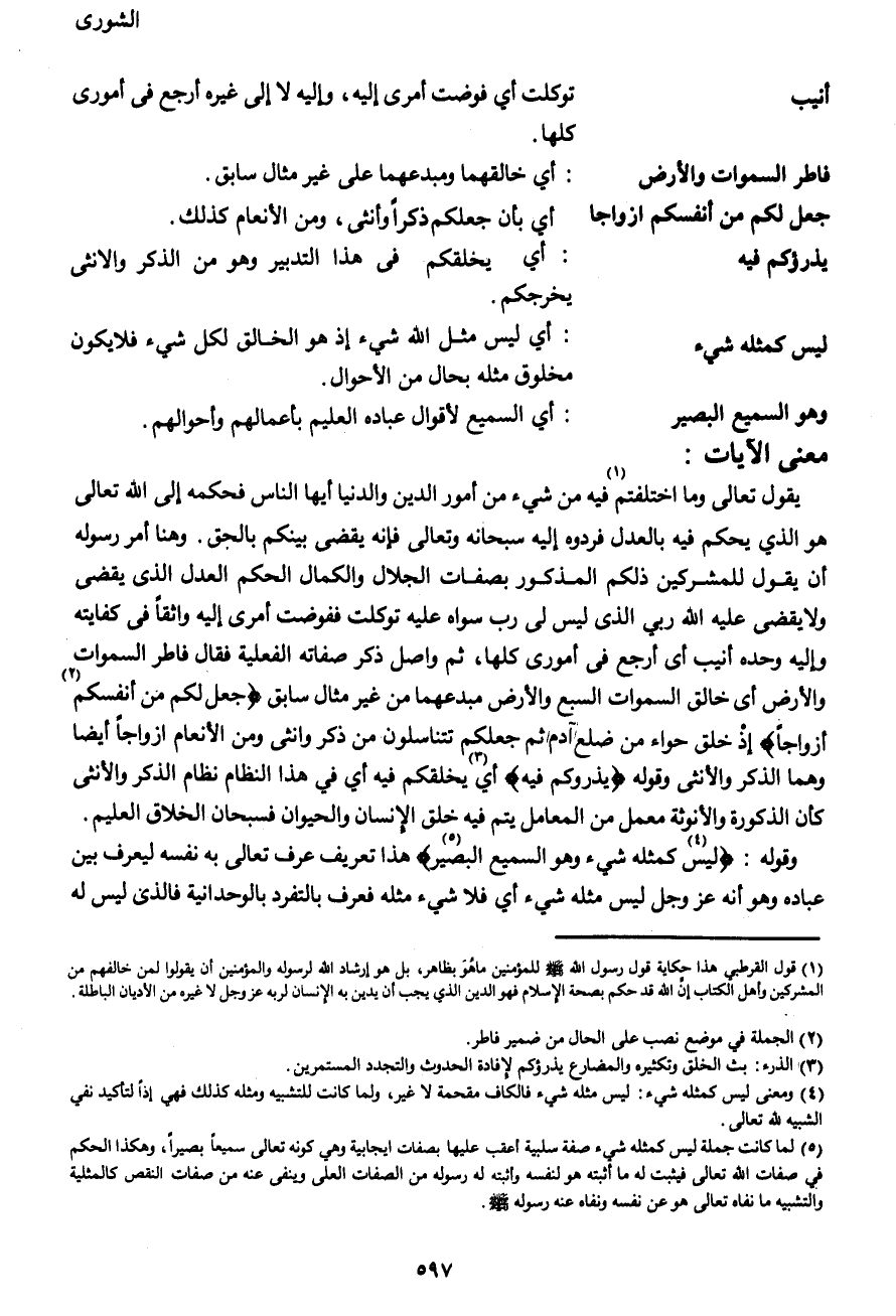 يقول تعالى {وَمَا اخْتَلَفْتُمْ (1) فِيهِ مِنْ شَيْءٍ} من أمور الدين والدنيا أيها الناس فحكمه إلى الله تعالى هو الذي يحكم فيه بالعدل فردوه إليه سبحانه وتعالى فإنه يقضي بينكم بالحق. وهنا أمر رسوله أن يقول للمشركين ذلكم المذكور بصفات الجلال والكمال الحَكم العدل الذي يقضي ولا يقضى عليه الله ربي الذي ليس لي رب سواه عليه توكلت ففوضت أمري إليه واثقاً في كفايته وإليه وحده أنيب أي أرجع في أموري كلها، ثم واصل ذكر صفاته الفعلية فقال {فَاطِرُ السَّمَاوَاتِ وَالْأَرْضِ} أي خالق السموات السبع والأرض مبدعهما من غير مثال سابق {جَعَلَ لَكُمْ مِنْ أَنْفُسِكُمْ (2) أَزْوَاجاً} إذ خلق حواء من ضلع آدم ثم جعلكم تتناسلون من ذكر وأنثى ومن الأنعام أزواجاً أيضاً وهما الذكر والأنثى وقوله {يَذْرَأُكُمْ فِيهِ} أي (3) يخلقكم فيه أي في هذا النظام نظام الذكر والأنثى كأن الذكورة والأنوثة معمل من المعامل يتم فيه خلق الإنسان والحيوان فسبحان الخلاق العليم.