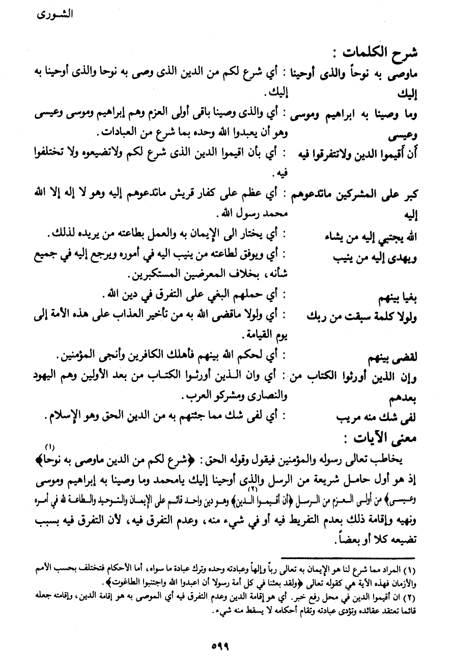 يخاطب تعالى رسوله المؤمنين فيقول وقوله الحق: {شَرَعَ لَكُمْ مِنَ الدِّينِ مَا وَصَّى بِهِ نُوحاً (1) } إذ هو أول حامل شريعة من الرسل والذي أوحينا إليك يا محمد {وَمَا وَصَّيْنَا بِهِ إِبْرَاهِيمَ وَمُوسَى وَعِيسَى} من أولي العزم من الرسل {أَنْ أَقِيمُوا (2) الدِّينَ} وهو دين واحد قائم على الإيمان والتوحيد والطاعة لله في أمره ونهيه وإقامة ذلك بعدم التفريط فيه أو في شيء منه، وعدم التفرق فيه، لأن التفرق فيه يسبب تضيعه كلاً أو بعضا.