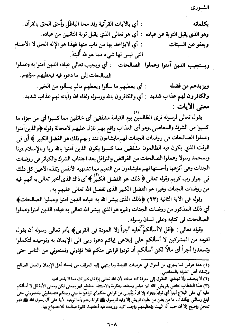 3- هذا الخطاب خاص بقريش قاله ابن عباس ومجاهد وعكرمة والاستثناء منقطع فهو بمعنى لكن ومعنى الآية قل لا أسألكم عليه أي على البلاغ أجراً أي ثواباً وجزاءً إلا أن تودّوني من قرابتي منكم أي تراعوا ما بيني وبينكم فتصدقوني وتنصروني حتى أبلغ رسالتي وذلك أنه ما من بطن من بطون قريش إلا وفيه للرسول صَلَّى اللهُ عَلَيْهِ وَسَلَّمَ قرابة رحم وأما توجيه الآية على آل رسول الله صَلَّى اللهُ عَلَيْهِ وَسَلَّمَ فهو تمحل واضح إلا أن حب آل البيت وتعظيمهم واجب أكيد ووردت فيه أحاديث كثيرة صالحة للاحتجاج بها.