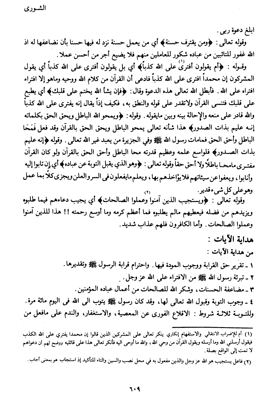 وقوله: {أَمْ يَقُولُونَ (1) افْتَرَى عَلَى اللهِ كَذِباً} أي بل يقولون أفترى على الله كذبا أي يقول المشركون إن محمداً افترى على الله كذباً فادعى أن القرآن كلام الله ووحيه وما هو إلا افتراء افتراه على الله. فأبطل الله تعالى هذه الدعوة وقال: {فَإِنْ يَشَأِ اللهُ يَخْتِمْ عَلَى قَلْبِكَ} أي يطبع على قلبك فتنسى القرآن ولا تقدر على قوله والنطق به، فكيف إذًا يقال إنه يفتري على الله كذباً والله قادرٌ على منعه والإحالة بينه وبين ما يقوله. وقوله: {وَيَمْحُ اللهُ الْبَاطِلَ وَيُحِقُّ الْحَقَّ بِكَلِمَاتِهِ إِنَّهُ عَلِيمٌ بِذَاتِ الصُّدُورِ} هذا شأنه تعالى يمحوا الباطل ويحق الحق بالقرآن وقد فعل فمحاَ الباطل وأحق الحق فما مات رسول الله صَلَّى اللهُ عَلَيْهِ وَسَلَّمَ وفي الجزيرة من يعبد غير الله تعالى. وقوله {إِنَّهُ عَلِيمٌ بِذَاتِ الصُّدُورِ} فلواسع علمه وعظيم قدرته محا الباطل وأحق الحق بالقرآن ولو كان القرآن مفترى ما محا باطلاً ولا أحق حقاً وقوله تعالى: {وَهُوَ الَّذِي يَقْبَلُ التَّوبَةَ عَنْ عِبَادِهِ} أي إن تابوا إليه وأنابوا، ويعفوا عن سيئاتهم فلا يؤاخذهم بها، ويعلم ما يفعلون في السر والعلن ويجزي كلاً بما عمل وهو على كل شيء قدير.