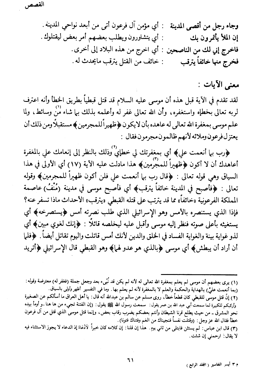 {رَبِّ بِمَا أَنْعَمْتَ عَلَيَّ} أي بمغفرتك لي خطإي (2) وذلك بالنظر إلى إنعامك علي بالمغفرة أعاهدك أن لا أكون {ظَهِيراً لِلْمُجْرِمِينَ (3) } هذا ما دلت عليه الآية (17) أي الأولى في هذا السياق وهي قوله تعالى: {قَالَ رَبِّ بِمَا أَنْعَمْتَ عَلَيَّ فَلَنْ أَكُونَ ظَهِيراً لِلْمُجْرِمِينَ} وقوله تعالى: {فَأَصْبَحَ فِي الْمَدِينَةِ خَائِفاً يَتَرَقَّبُ} أي فأصبح موسى في مدينة (منف) عاصمة المملكة الفرعونية {خَائِفاً} مما قد يترتب على قتله القبطي {يَتَرَقَّبُ} الأحداث ماذا تسفر عنه؟ {فَإِذَا الَّذِي اسْتَنْصَرَهُ بِالْأَمْسِ} وهو الإسرائيلي الذي طلب نصرته أمس {يَسْتَصْرِخُهُ} أي يستغيثه بأعلى صوته فنظر إليه موسى وأقبل عليه ليخلصه قائلاً: {إِنَّكَ لَغَوِيٌّ مُبِينٌ} أي لذو غواية بينة والغواية الفساد في الخلق والدين لأنك أمس قاتلت واليوم تقاتل أيضا. {فَلَمَّا أَنْ أَرَادَ أَنْ يَبْطِشَ} أي موسى {بِالَّذِي هُوَ عَدُوٌّ لَهُمَا} وهو القبطي قال الإسرائيلي {أَتُرِيدُ