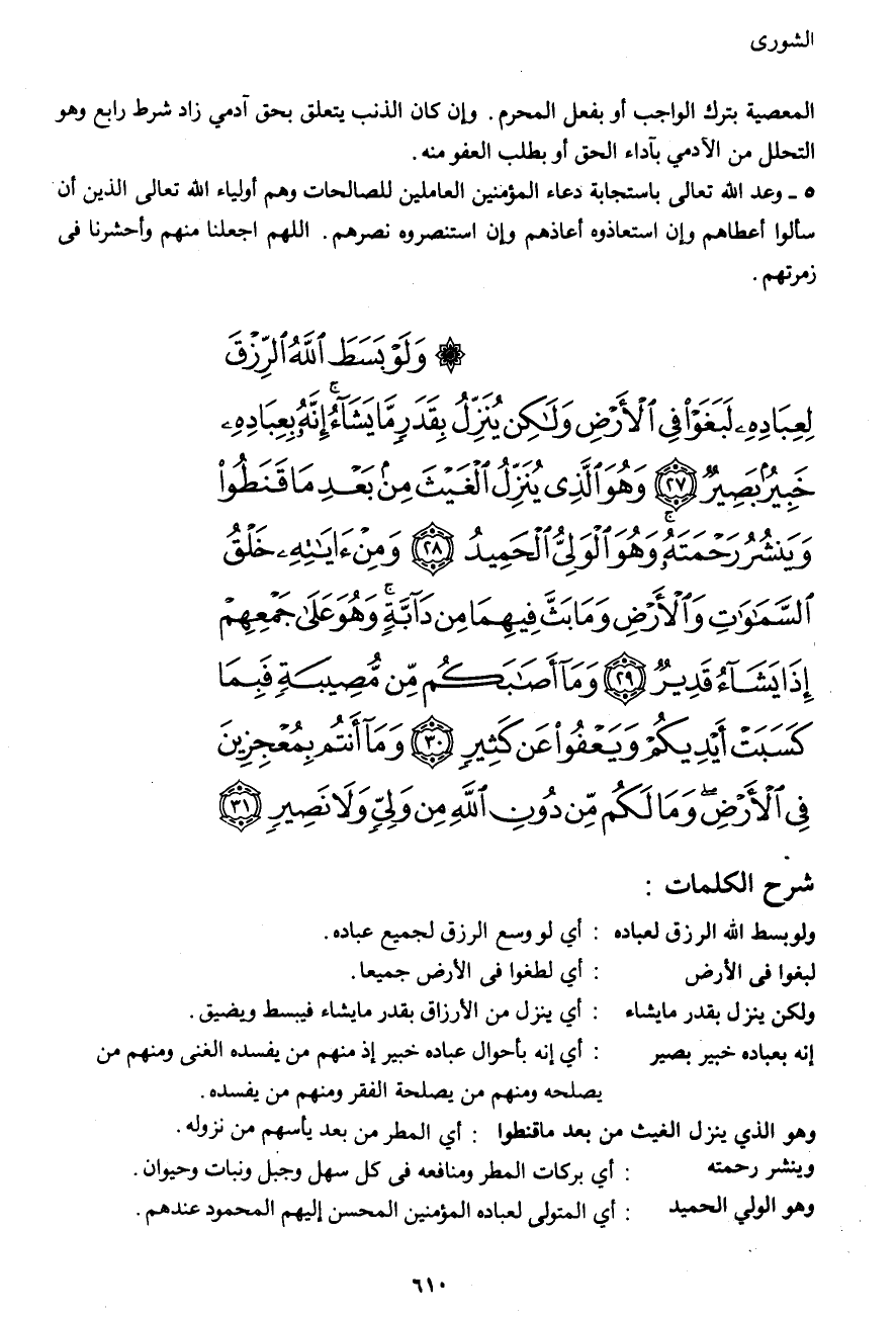 وَلَوْ بَسَطَ اللهُ الرِّزْقَ لِعِبَادِهِ لَبَغَوْا فِي الْأَرْضِ وَلَكِنْ يُنَزِّلُ بِقَدَرٍ مَا يَشَاءُ إِنَّهُ بِعِبَادِهِ خَبِيرٌ بَصِيرٌ (27) وَهُوَ الَّذِي يُنَزِّلُ الْغَيْثَ مِنْ بَعْدِ مَا قَنَطُوا وَيَنْشُرُ رَحْمَتَهُ وَهُوَ الْوَلِيُّ الْحَمِيدُ (28) وَمِنْ آيَاتِهِ خَلْقُ السَّمَاوَاتِ وَالْأَرْضِ وَمَا بَثَّ فِيهِمَا مِنْ دَابَّةٍ وَهُوَ عَلَى جَمْعِهِمْ إِذَا يَشَاءُ قَدِيرٌ (29) وَمَا أَصَابَكُمْ مِنْ مُصِيبَةٍ فَبِمَا كَسَبَتْ أَيْدِيكُمْ وَيَعْفُو عَنْ كَثِيرٍ (30) وَمَا أَنْتُمْ بِمُعْجِزِينَ فِي الْأَرْضِ وَمَا لَكُمْ مِنْ دُونِ اللهِ مِنْ وَلِيٍّ وَلا نَصِيرٍ (31)