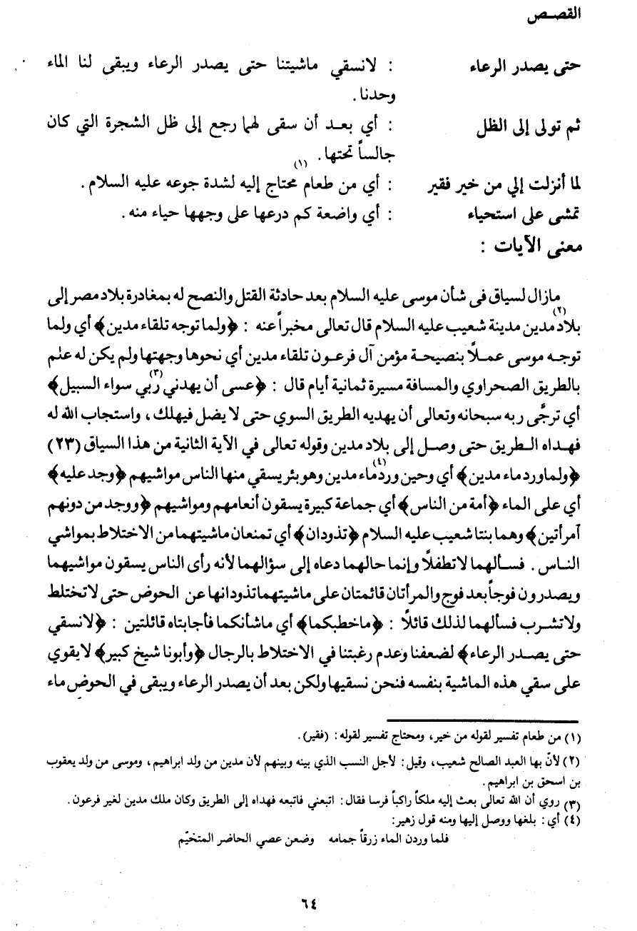 ما زال السياق في شأن موسى عليه السلام بعد حادثة القتل والنصح له بمغادرة بلاد مصر إلى بلاد (2) مدين مدينة شعيب عليه السلام قال تعالى مخبرا عنه: {وَلَمَّا تَوَجَّهَ تِلْقَاءَ مَدْيَنَ} أي ولما توجه موسى عملا بنصيحة مؤمن آل فرعون تلقاء مدين أي نحوها وجهتها ولم يكن له علم بالطريق الصحراوي والمسافة مسيرة ثمانية أيام قال: {عَسَى رَبِّي أَنْ يَهْدِيَنِي (3) سَوَاءَ السَّبِيلِ} أي ترجَّى ربه سبحانه وتعالى أن يهديه الطريق السوي حتى لا يضل فيهلك، واستجاب الله له فهداه الطريق حتى وصل إلى بلاد مدين وقوله تعالى في الآية الثانية من هذا السياق (23) {وَلَمَّا وَرَدَ مَاءَ مَدْيَنَ يَسْقُونَ} أي وحين (4) ورد ماء مدين وهو بئر يسقي منها الناس مواشيهم {وَجَدَ عَلَيْهِ} أي على الماء {أُمَّةً مِنَ النَّاسِ} أي جماعة كبيرة يسقون أنعامهم ومواشيهم {وَوَجَدَ مِنْ دُونِهِمُ امْرَأَتَيْنِ} وهما بنتا شعيب عليه السلام {تَذُودَانِ} أي تمنعان ماشيتهما من الاختلاط بمواشي الناس. فسألهما لا تطفلاً وإنما حالهما دعاه إلى سؤالهما لأنه رأى الناس يسقون مواشيهم ويصدرون فوجاً بعد فوج والمرأتان قائمتان على ماشيتهما تذودانها عن الحوض حتى لا تختلط ولا تشرب فسألهما لذلك قائلاً: {مَا خَطْبُكُمَا} أي ما شأنكما فأجابتاه قائلتين: {لا نَسْقِي حَتَّى يُصْدِرَ الرِّعَاءُ} لضعفنا وعدم رغبتنا في الاختلاط بالرجال {وَأَبُونَا شَيْخٌ كَبِيرٌ} لا يقوى على سقي هذه الماشية بنفسه فنحن نسقيها ولكن بعد ما يصدر الرعاء ويبقى في الحوض ماء