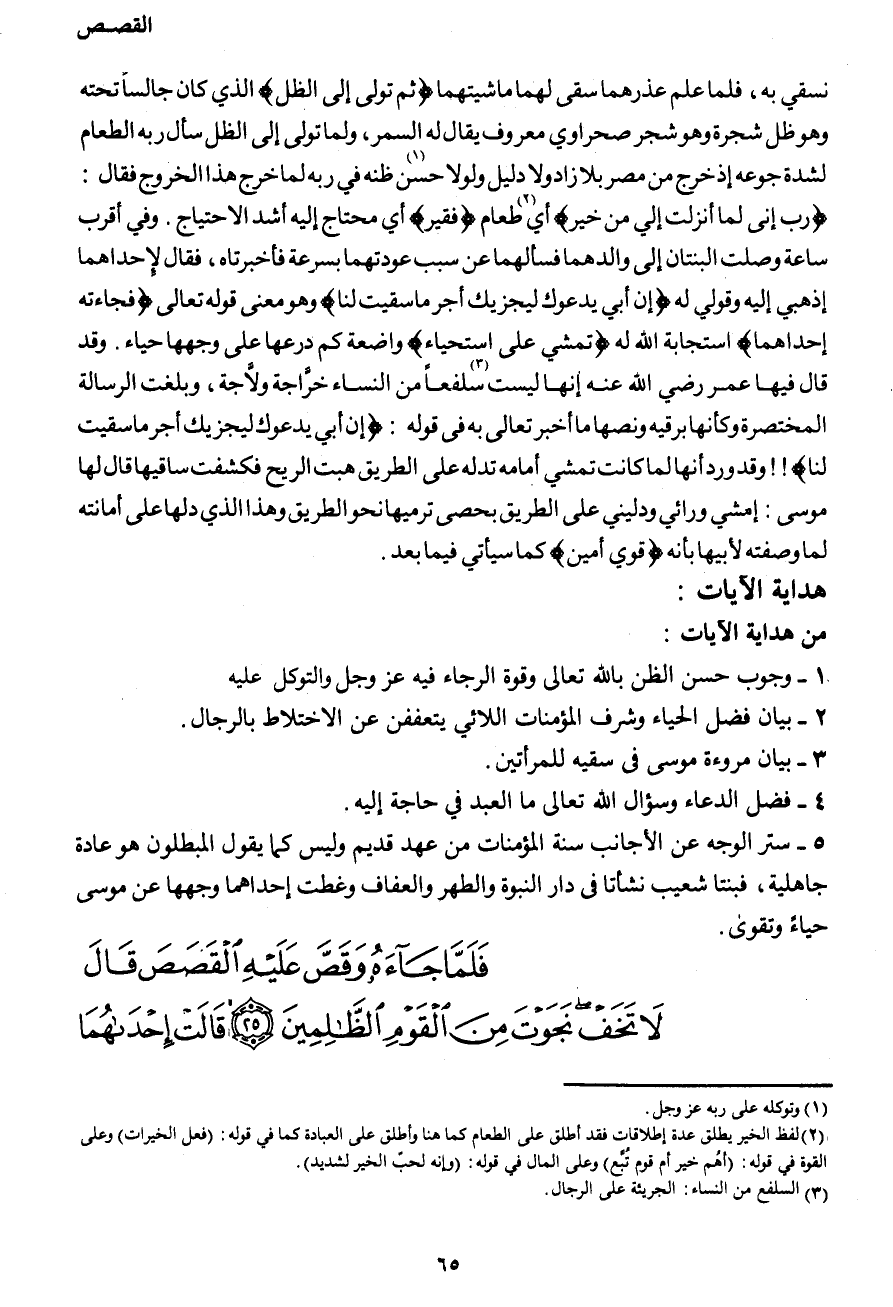 نسقي به، فلما عذرهما سقى لهما ماشيتهما {ثُمَّ تَوَلَّى إِلَى الظِّلِّ فَقِيرٌ} الذي كان جالسا تحته وهو ظل شجرة وهو شجر صحراوي معروف يقال السمر، ولما تولى إلى الظل سأل ربه الطعام لشدة جوعه إذ خرج من مصر بلا زاد ولا دليل ولولا حسن (1) ظنه في ربه لما خرج هذا الخروج فقال: {رَبِّ إِنِّي لِمَا أَنْزَلْتَ إِلَيَّ مِنْ خَيْرٍ} أي (2) طعام {فَقِيرٌ} أي محتاج إليه شدة الاحتياج. وفي أقرب ساعة وصلت البنتان إلى والدهما فسألهما عن سبب عودتهما بسرعة فأخبرتاه، فقال لإحداهما اذهبي إليه وقولي له: {إِنَّ أَبِي يَدْعُوكَ لِيَجْزِيَكَ أَجْرَ مَا سَقَيْتَ لَنَا} وهو معنى قوله تعالى {فَجَاءَتْهُ إِحْدَاهُمَا} استجابة الله له {تَمْشِي عَلَى اسْتِحْيَاءٍ} واضعة كم درعها على وجهها حياء. وقد قال فيها عمر رضي الله عنه إنها ليست سلفعاً (3) من النساء خرّاجة ولاّجة، وبلغت الرسالة المختصرة وكأنها برقية ونصها ما أخبر الله تعالى به في قوله: {إِنَّ أَبِي يَدْعُوكَ لِيَجْزِيَكَ أَجْرَ مَا سَقَيْتَ لَنَا} !! وقد ورد أنها لما كانت تمشي أمامه تدله على الطريق هبت الريح فكشفت ساقيها قال لها موسى: امشي ورائي ودليني على الطريق بحصى ترميها نحو الطريق وهذا الذي دلها على أمانته لما وصفته لأبيها بأنه {قَوِيٌّ أَمِينٌ} كما سيأتي فيما بعد.