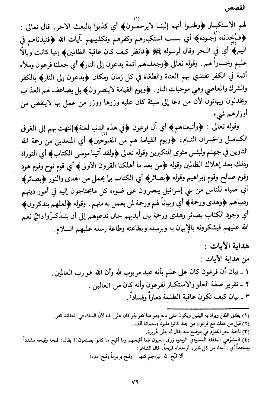 وقوله تعالى: {وَأَتْبَعْنَاهُمْ} أي آل فرعون {فِي هَذِهِ الدُّنْيَا لَعْنَةً} انتهت بهم إلى الغرق الكامل والخسران التام، {وَيَوْمَ الْقِيَامَةِ هُمْ مِنَ الْمَقْبُوحِينَ (4) } أي المبعدين من رحمة الله الثاوين في جهنم ولبئس مثوى المتكبرين وقوله تعالى {وَلَقَدْ آتَيْنَا مُوسَى الْكِتَابَ} أي التوراة وذلك بعد إهلاك الظالمين وقوله {مِنْ بَعْدِ مَا أَهْلَكْنَا الْقُرُونَ الْأُولَى} أي قوم نوح وقوم هود وقوم صالح وقوم إبراهيم وقوله {بَصَائِرَ} أي الكتاب بما يحمل من الهدى والنور {بَصَائِرَ} أي ضياء للناس من بني إسرائيل يبصرون على ضوءه كل ما يحتاجون إليه في أمور دينهم ودنياهم {وَهُدىً وَرَحْمَةً} أي وبيانا لهم ورحمة لمن يعمل به منهم. وقوله {لِلنَّاسِ لَعَلَّهُمْ يَتَذَكَّرُونَ} أي وجود الكتاب بصائر وهدى ورحمة بين أيديهم حال تدعوهم إلى أن يتذكّروا دائماً نعم الله عليهم فيشكرونه بالإيمان به وبرسله وبطاعته وطاعة رسله عليهم السلام.