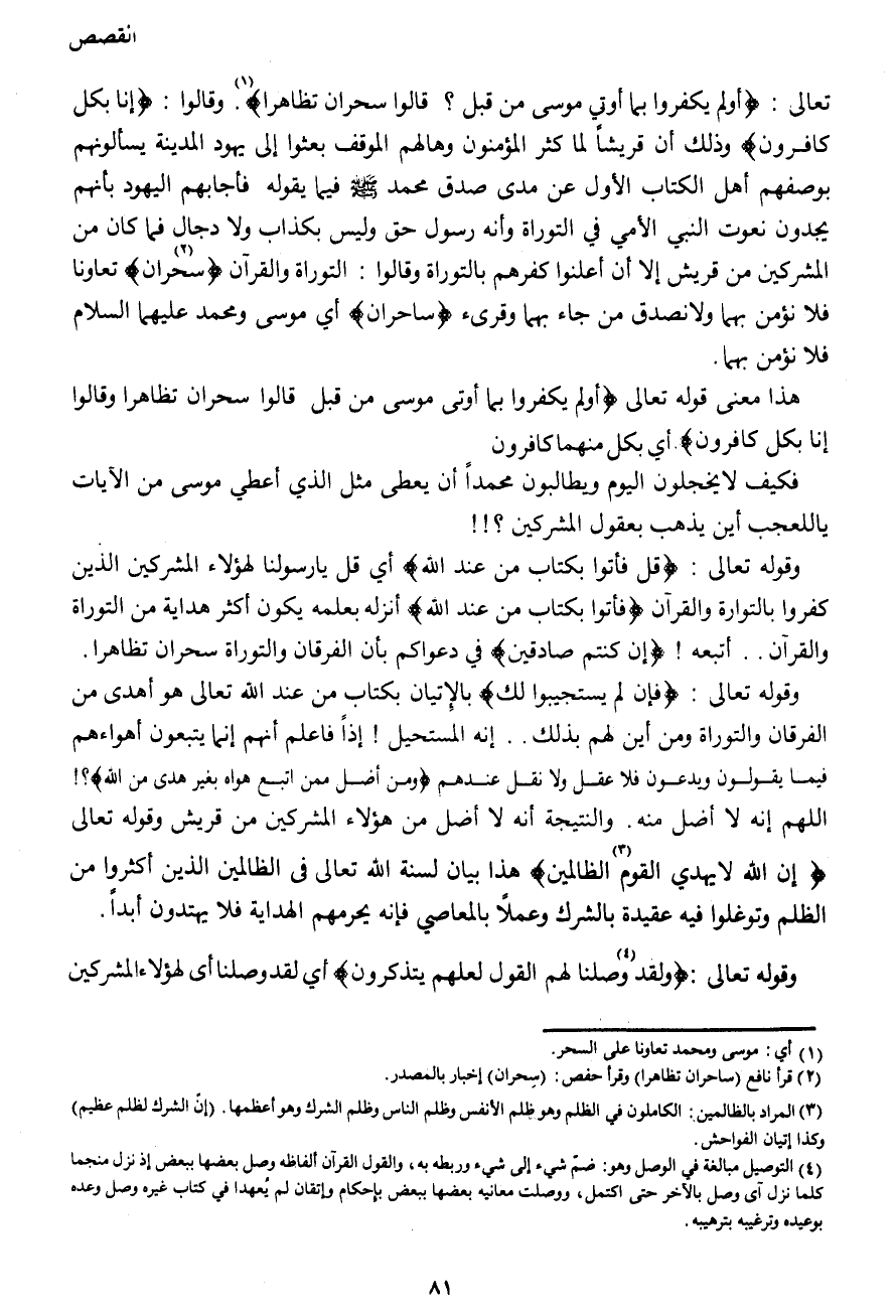 تعالى: {أَوَلَمْ يَكْفُرُوا بِمَا أُوتِيَ مُوسَى مِنْ قَبْلُ قَالُوا سِحْرَانِ تَظَاهَرَا} (1) . وقالوا: {إِنَّا بِكُلٍّ كَافِرُونَ} وذلك أن قريشا لما كثر المؤمنون وهالهم الموقف بعثوا إلى يهود المدينة يسألونهم بوصفهم أهل الكتاب الأول عن مدى صدق محمد صَلَّى اللهُ عَلَيْهِ وَسَلَّمَ فيما يقوله فأجابهم اليهود بأنهم يجدون نعوت النبي الأمي في التوراة وأنه رسول حق وليس بكذاب ولا دجال فما كان من المشركين من قريش إلا أن أعلنو كفرهم بالتوراة وقالوا: التوراة والقرآن {سِحْرَانِ (2) } تعاونا فلا نؤمن بهما ولا نصدق من جاء بهما وقرئ {سَاحِرَانِ} أي موسى ومحمد عليهما السلام فلا نؤمن بهما.