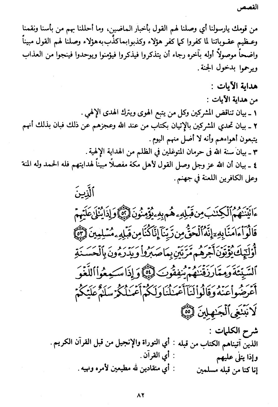 الَّذِينَ آتَيْنَاهُمُ الْكِتَابَ مِنْ قَبْلِهِ هُمْ بِهِ يُؤْمِنُونَ (52) وَإِذَا يُتْلَى عَلَيْهِمْ قَالُوا آمَنَّا بِهِ إِنَّهُ الْحَقُّ مِنْ رَبِّنَا إِنَّا كُنَّا مِنْ قَبْلِهِ مُسْلِمِينَ (53) أُولَئِكَ يُؤْتَوْنَ أَجْرَهُمْ مَرَّتَيْنِ بِمَا صَبَرُوا وَيَدْرَأُونَ بِالْحَسَنَةِ السَّيِّئَةَ وَمِمَّا رَزَقْنَاهُمْ يُنْفِقُونَ (54) وَإِذَا سَمِعُوا اللَّغْوَ أَعْرَضُوا عَنْهُ وَقَالُوا لَنَا أَعْمَالُنَا وَلَكُمْ أَعْمَالُكُمْ سَلامٌ عَلَيْكُمْ لا نَبْتَغِي الْجَاهِلِينَ (55)