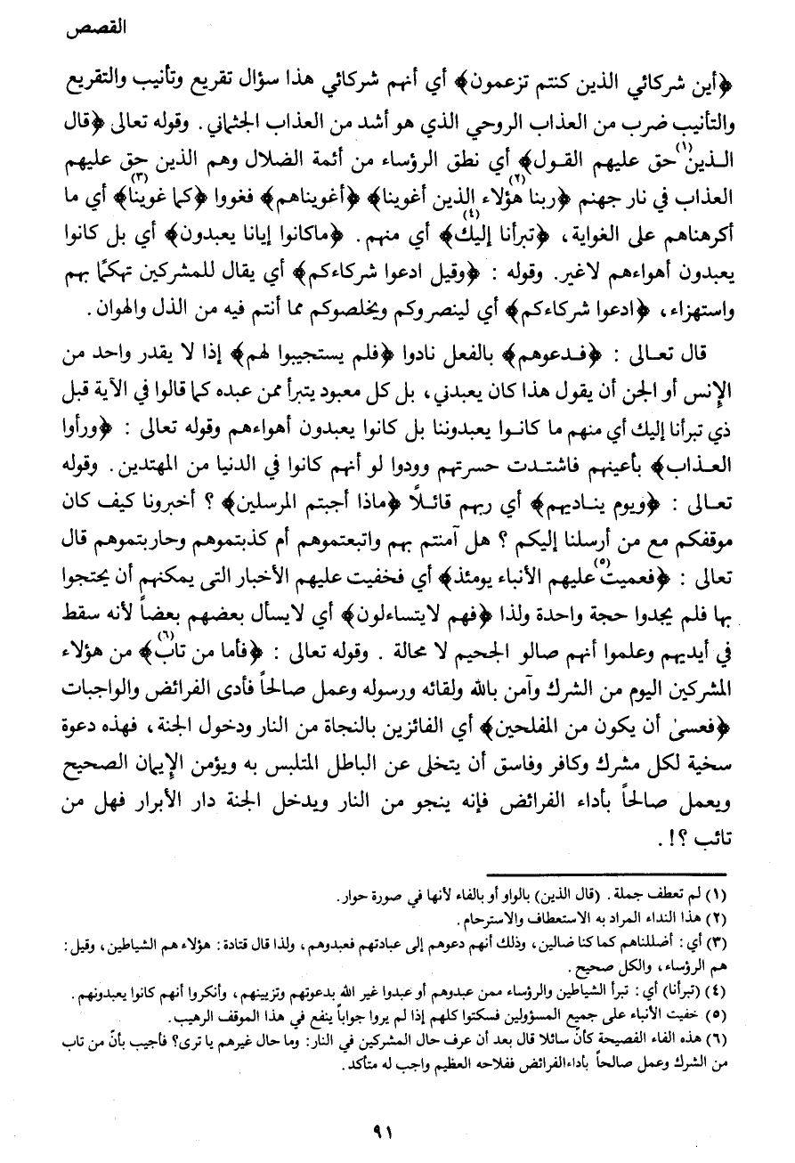 {أَيْنَ شُرَكَائِيَ الَّذِينَ كُنْتُمْ تَزْعُمُونَ} أي أنهم شركائي هذا سؤال تقريع وتأنيب والتقريع والتأنيب ضرب من العذاب الروحي الذي هو أشد من العذاب الجثماني. وقوله تعالى {قَالَ الَّذِينَ (1) حَقَّ عَلَيْهِمُ الْقَوْلُ} أي نطق الرؤساء من أئمة الضلال وهم الذين حق عليهم العذاب في نار جهنم {رَبَّنَا (2) هَؤُلاءِ الَّذِينَ أَغْوَيْنَا} {أَغْوَيْنَاهُمْ} فغووا {كَمَا غَوَيْنَا (3) } أي ما أكرهناهم على الغواية، {تَبَرَّأْنَا (4) إِلَيْكَ} أي منهم. {مَا كَانُوا إِيَّانَا يَعْبُدُونَ} بل كانوا يعبدون أهواءهم لا غير. وقوله: {وَقِيلَ ادْعُوا شُرَكَاءَكُمْ} يقال للمشركين تهكّما بهم واستهزاء، {ادْعُوا شُرَكَاءَكُمْ} أي لينصروكم ويخلصوكم مما أنتم فيه من الذل والهوان.