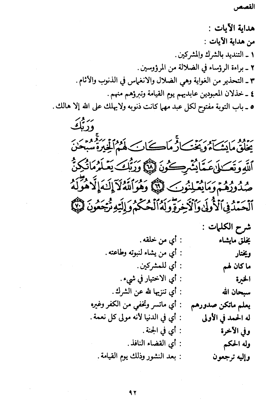 وَرَبُّكَ يَخْلُقُ مَا يَشَاءُ وَيَخْتَارُ مَا كَانَ لَهُمُ الْخِيَرَةُ سُبْحَانَ اللهِ وَتَعَالَى عَمَّا يُشْرِكُونَ (68) وَرَبُّكَ يَعْلَمُ مَا تُكِنُّ صُدُورُهُمْ وَمَا يُعْلِنُونَ (69) وَهُوَ اللهُ لا إِلَهَ إِلَّا هُوَ لَهُ الْحَمْدُ فِي الْأُولَى وَالْآخِرَةِ وَلَهُ الْحُكْمُ وَإِلَيْهِ تُرْجَعُونَ (70)