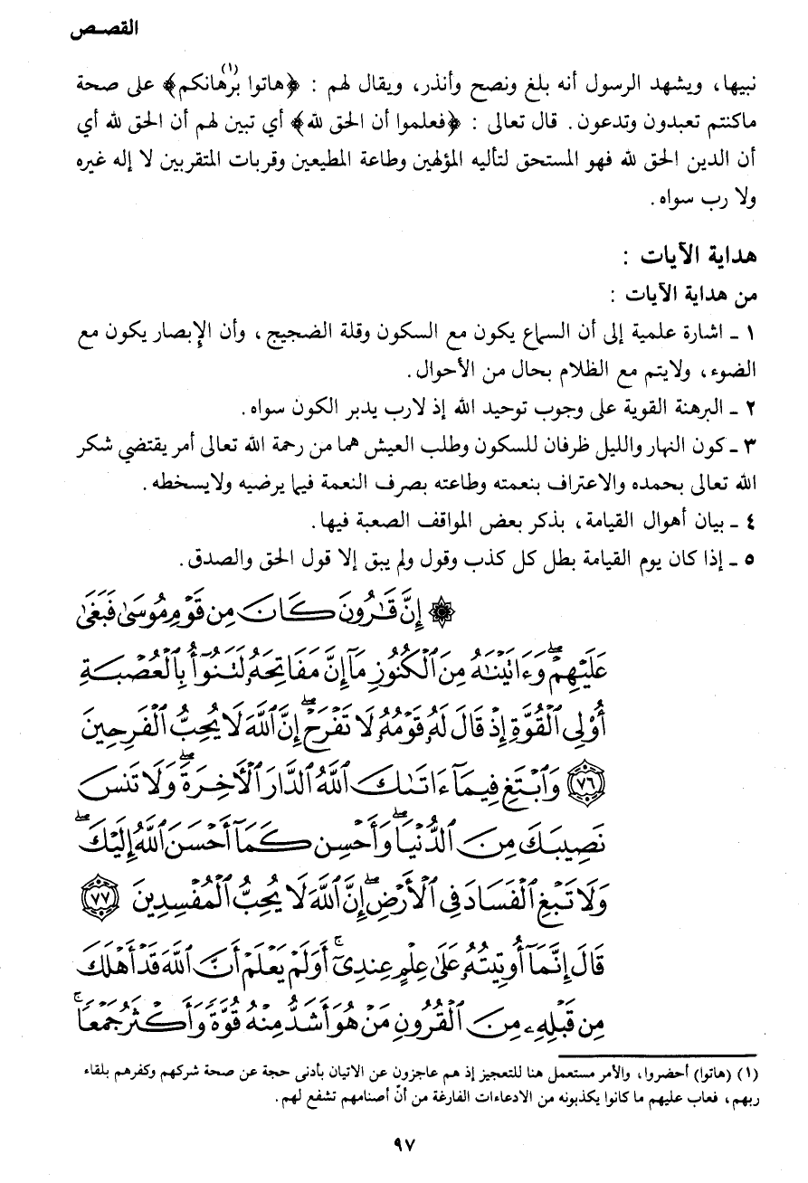 وَابْتَغِ فِيمَا آتَاكَ اللهُ الدَّارَ الْآخِرَةَ وَلا تَنْسَ نَصِيبَكَ مِنَ الدُّنْيَا وَأَحْسِنْ كَمَا أَحْسَنَ اللهُ إِلَيْكَ وَلا تَبْغِ الْفَسَادَ فِي الْأَرْضِ إِنَّ اللهَ لا يُحِبُّ الْمُفْسِدِينَ (77) قَالَ إِنَّمَا أُوتِيتُهُ عَلَى عِلْمٍ عِنْدِي أَوَلَمْ يَعْلَمْ أَنَّ اللهَ قَدْ أَهْلَكَ مِنْ قَبْلِهِ مِنَ الْقُرُونِ مَنْ هُوَ أَشَدُّ مِنْهُ قُوَّةً وَأَكْثَرُ جَمْعاً