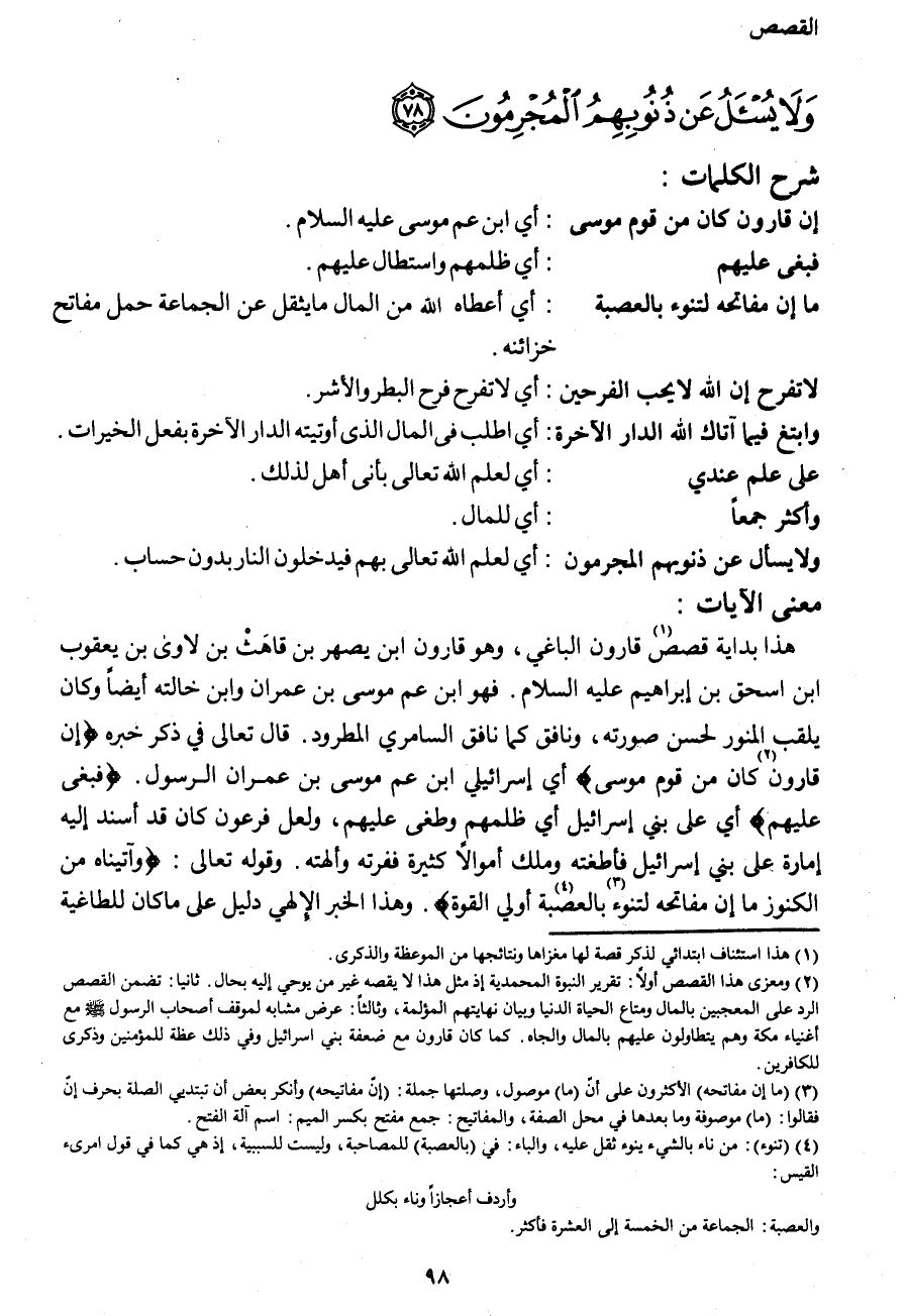 4 - (تنوء) من ناء بالشيء ينوء ثقل عليه، والباء: في (بالعصبة) للمصاحبة، وليست للسببية، إذ هي كما في قول امرؤ القيس: