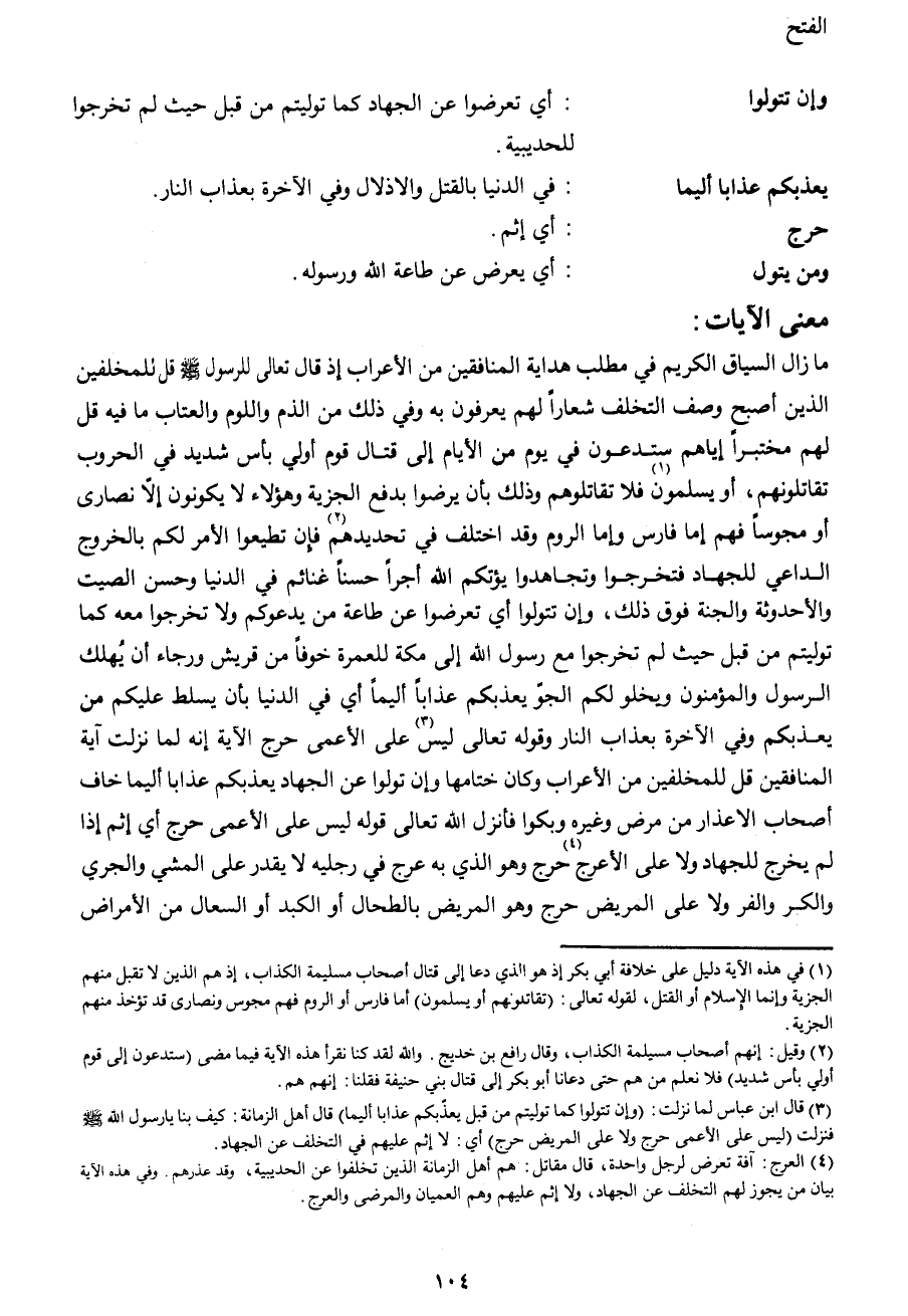 3 قال ابن عباس لما نزلت: {وَإِنْ تَتَوَلَّوْا كَمَا تَوَلَّيْتُمْ مِنْ قَبْلُ يُعَذِّبْكُمْ عَذَاباً أَلِيماً} قال أهل الزمانة: كيف بنا يا رسول الله صَلَّى اللهُ عَلَيْهِ وَسَلَّمَ فنزلت {ليس على الأعمى حرج ولا على المريض حرج} أي: لا إثم عليهم في التخلف عن الجهاد.