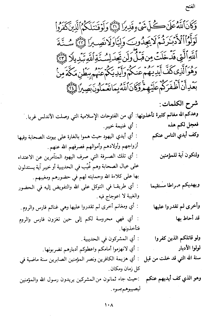 وَكَانَ اللهُ عَلَى كُلِّ شَيْءٍ قَدِيراً (21) وَلَوْ قَاتَلَكُمُ الَّذِينَ كَفَرُوا لَوَلَّوُا الأَدْبَارَ ثُمَّ لا يَجِدُونَ وَلِيّاً وَلا نَصِيراً (22) سُنَّةَ اللهِ الَّتِي قَدْ خَلَتْ مِنْ قَبْلُ وَلَنْ تَجِدَ لِسُنَّةِ اللهِ تَبْدِيلا (23) وَهُوَ الَّذِي كَفَّ أَيْدِيَهُمْ عَنْكُمْ وَأَيْدِيَكُمْ عَنْهُمْ بِبَطْنِ مَكَّةَ مِنْ بَعْدِ أَنْ أَظْفَرَكُمْ عَلَيْهِمْ وَكَانَ اللهُ بِمَا تَعْمَلُونَ بَصِيراً (24)