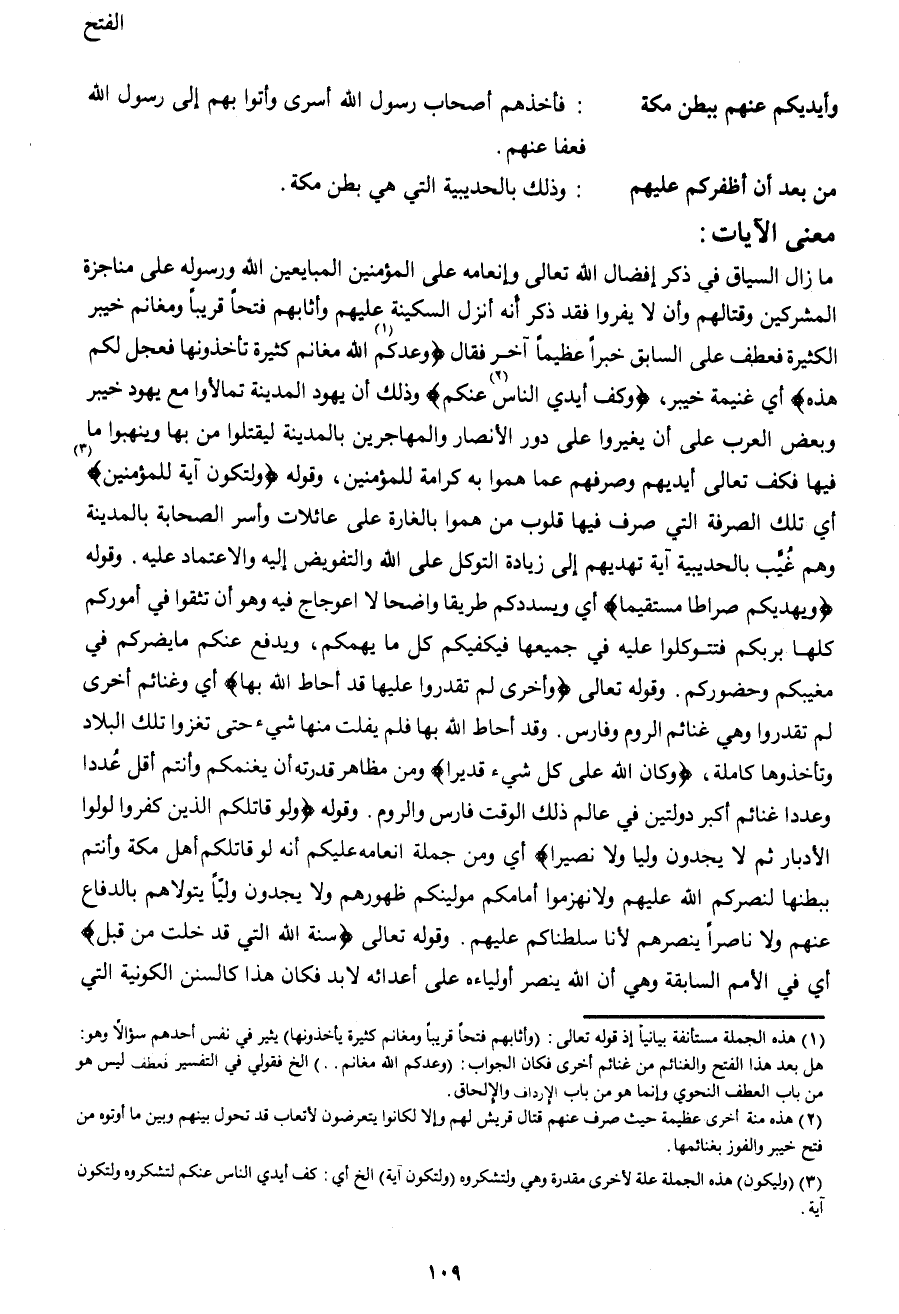 ما زال السياق في ذكر إفضال الله تعالى وإنعامه على المؤمنين المبايعين الله ورسوله على مناجزة المشركين وقتالهم وأن لا يفروا فقد ذكر أنه أنزل السكينة عليهم وأثابهم فتحاً قريباً ومغانم خيبر الكثيرة فعطف على السابق خبراً عظيماً آخر فقال {وَعَدَكُمُ1 اللهُ مَغَانِمَ كَثِيرَةً تَأْخُذُونَهَا فَعَجَّلَ لَكُمْ هَذِهِ} أي غنيمة خيبر، {وَكَفَّ أَيْدِيَ النَّاسِ2 عَنْكُمْ} وذلك أن يهود المدينة تمالأوا مع يهود خيبر وبعض العرب على أن يغيروا على دور الأنصار والمهاجرين بالمدينة ليقتلوا من بها وينهبوا ما فيها فكف تعالى أيديهم وصرفهم عما هموا به كرامة للمؤمنين، وقوله {وَلِتَكُونَ آيَةً لِلْمُؤْمِنِينَ} 3 أي تلك الصرفة التي صرف فيها قلوب من هموا بالغارة على عائلات وأسر الصحابة بالمدينة وهم غيب بالحديبية آية تهديهم إلى زيادة التوكل على الله والتفويض إليه والاعتماد عليه. {وَيَهْدِيَكُمْ صِرَاطاً مُسْتَقِيماً} أي ويسددكم طريقا واضحا لا اعوجاج فيه وهو أن تثقوا في أموركم كلها بربكم فتتوكلوا عليه في جميعها فيكفيكم كل ما يهمكم، ويدفع عنكم ما يضركم في مغيبكم وحضوركم. وقوله تعالى {وَأُخْرَى لَمْ تَقْدِرُوا عَلَيْهَا قَدْ أَحَاطَ اللهُ بِهَا} أي وغنائم أخرى لم تقدروا وهي غنائم الروم وفارس. وقد أحاط الله بها فلم يفلت منها شيء حتى تغزوا تلك البلاد وتأخذوها كاملة، {وَكَانَ اللهُ عَلَى كُلِّ شَيْءٍ قَدِيراً} ومن مظاهر قدرته أن يغنمكم وأنتم أقل عددا وعددا غنائم أكبر دولتين في عالم ذلك الوقت فارس والروم. وقوله {وَلَوْ قَاتَلَكُمُ الَّذِينَ كَفَرُوا لَوَلَّوُا الأَدْبَارَ ثُمَّ لا يَجِدُونَ وَلِيّاً وَلا نَصِيراً} أي ومن جملة إنعامه عليكم أنه لو قاتلكم أهل مكة وأنتم ببطنها لنصركم الله عليهم ولا انهزموا أمامكم مولينكم ظهورهم ولا يجدون ولياً يتولاهم بالدفاع عنهم ولا ناصراً ينصرهم لأنا سلطناكم عليهم. وقوله تعالى {سُنَّةَ اللهِ الَّتِي قَدْ خَلَتْ مِنْ قَبْلُ} أي في الأمم السابقة وهي لأن الله ينصر أولياءه على أعدائه لابد فكان هذا كالسنن الكونية التي