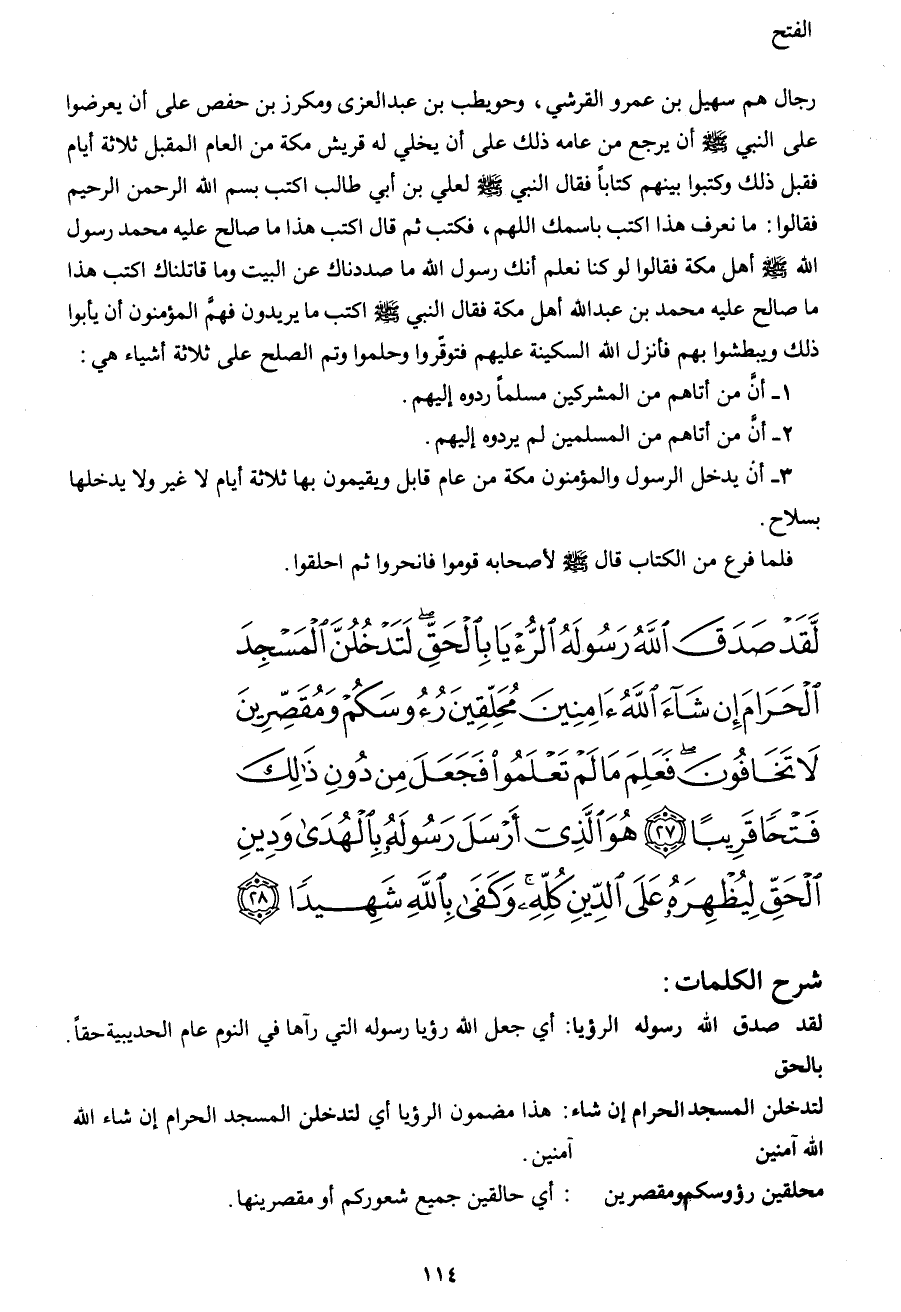 لَقَدْ صَدَقَ اللهُ رَسُولَهُ الرُّؤْيا بِالْحَقِّ لَتَدْخُلُنَّ الْمَسْجِدَ الْحَرَامَ إِنْ شَاءَ اللهُ آمِنِينَ مُحَلِّقِينَ رُؤُوسَكُمْ وَمُقَصِّرِينَ لا تَخَافُونَ فَعَلِمَ مَا لَمْ تَعْلَمُوا فَجَعَلَ مِنْ دُونِ ذَلِكَ فَتْحاً قَرِيباً (27) هُوَ الَّذِي أَرْسَلَ رَسُولَهُ بِالْهُدَى وَدِينِ الْحَقِّ لِيُظْهِرَهُ عَلَى الدِّينِ كُلِّهِ وَكَفَى بِاللهِ شَهِيداً (28)