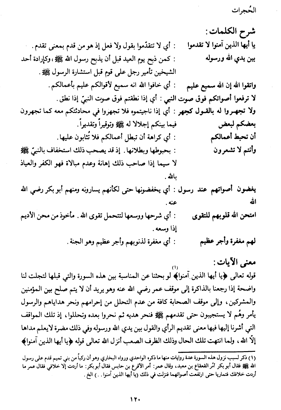 قوله تعالى {يَا أَيُّهَا الَّذِينَ آمَنُوا} 1 لو بحثنا عن المناسبة بين هذه السورة والتي قبلها لتجلت لنا واضحة إذا رجعنا بالذاكرة إلى موقف عمر رضي الله عنه وهو يريد أن لا يتم صلح بين المؤمنين والمشركين، وإلى موقف الصحابة كافة من عدم التحلل من إحرامهم ونحر هداياهم والرسول يأمر وهم لا يستجيبون حتى تقدم صَلَّى اللهُ عَلَيْهِ وَسَلَّمَ فنحر هديه ثم نحروا بعده وتحللوا، إذ تلك المواقف التي أشرنا إليها فيها معنى تقديم الرأي والقول بين يدي الله ورسوله وفي ذلك مضرة لا يعلم مداها إلا الله، ولما انتهت تلك الحال وذلك الظرف الصعب أنزل الله تعالى قوله {يَا أَيُّهَا الَّذِينَ آمَنُوا}