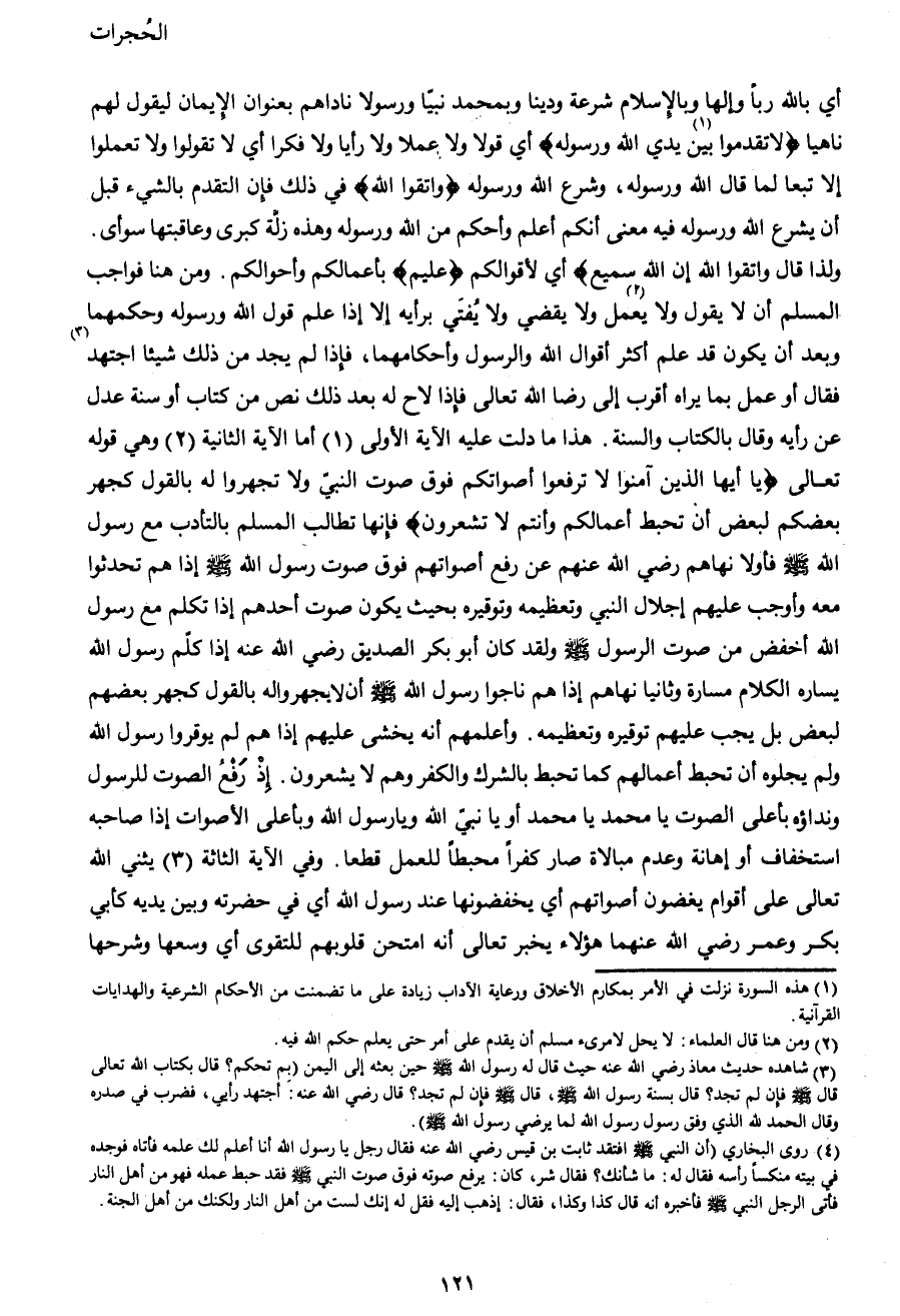 أي بالله رباً وإلها وبالإسلام شرعة ودينا وبمحمد نبيا ورسولا ناداهم بعنوان الإيمان ليقول لهم ناهيا {لا تُقَدِّمُوا 1بَيْنَ يَدَيِ اللهِ وَرَسُولِهِ} أي قولا ولا عملا ولا رأيا ولا فكرا أي لا تقولوا ولا تعملوا إلا تبعا لما قال الله ورسوله، وشرع الله ورسوله {وَاتَّقُوا اللهَ} في ذلك فإن التقدم بالشيء قبل أن يشرع الله ورسوله فيه معنى أنكم أعلم وأحكم من الله ورسوله وهذه زلة كبرى وعاقبتها سوأى. ولذا قال {وَاتَّقُوا اللهَ إِنَّ اللهَ سَمِيعٌ} أي لأقوالكم {عَلِيمٌ} بأعمالكم وأحوالكم. ومن هنا فواجب المسلم أن لا يقول ولا يعمل2 ولا يقضي ولا يفتي برأيه إلا إذا علم قول الله ورسوله وحكمهما وبعد أن يكون قد علم أكثر أقوال الله والرسول وأحكامهما، فإذا لم يجد من ذلك شيئا اجتهد3 فقال أو عمل بما يراه أقرب إلى رضا الله تعالى فإذا لاح له بعد ذلك نص من كتاب أو سنة عدل عن رأيه وقال بالكتاب والسنة وهذا ما دلت عليه الآية الأولى (1) أما الآية الثانية (2) وهي قوله تعالى {يَا أَيُّهَا الَّذِينَ آمَنُوا لا تَرْفَعُوا أَصْوَاتَكُمْ فَوْقَ صَوْتِ النَّبِيِّ وَلا تَجْهَرُوا لَهُ بِالْقَوْلِ كَجَهْرِ بَعْضِكُمْ لِبَعْضٍ أَنْ تَحْبَطَ أَعْمَالُكُمْ وَأَنْتُمْ لا تَشْعُرُونَ} فإنها تطالب المسلم بالتأدب مع رسول الله صَلَّى اللهُ عَلَيْهِ وَسَلَّمَ فأولا نهاهم رضي الله عنهم عن رفع أصواتهم فوق صوت رسول الله صَلَّى اللهُ عَلَيْهِ وَسَلَّمَ إذا هم تحدثوا معه وأوجب عليهم إجلال النبي وتعظيمه وتوقيره بحيث يكون صوت أحدهم إذا تكلم مع رسول الله أخفض من صوت الرسول صَلَّى اللهُ عَلَيْهِ وَسَلَّمَ ولقد كان أبو بكر الصديق رضي الله عنه إذا كلم رسول الله يساره الكلام مسارة وثانيا ونهاهم إذا هم ناجوا رسول الله صَلَّى اللهُ عَلَيْهِ وَسَلَّمَ أن لا يجهروا له بالقول كجهر بعضهم لبعض بل يجب عليهم توقيره وتعظيمه. وأعلمهم أنه يخشى عليهم إذ هم لم يوقروا رسول الله ولم يجلوه أن تحبط أعمالهم كما تحبط بالشرك والكفر وهم لا يشعرون. إذ رفع الصوت للرسول ونداؤه بأعلى الصوت يا محمد يا محمد أو يا نبي الله ويا رسول الله وبأعلى الأصوات إذا صاحبه استخفاف أو إهانة وعدم مبالاة صار كفراً محبطاً للعمل قطعا. وفي الآية الثالثة (3) يثني الله تعالى على أقوام يغضون أصواتهم أي يخفضونها عند رسول الله أي في حضرته وبين يديه كأبي بكر وعمر رضي الله عنهما هؤلاء يخبر تعالى أنه امتحن قلوبهم بالتقوى أي وسعها وشرحها