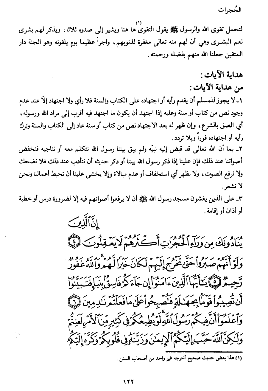 إِنَّ الَّذِينَ يُنَادُونَكَ مِنْ وَرَاءِ الْحُجُرَاتِ أَكْثَرُهُمْ لا يَعْقِلُونَ (4) وَلَوْ أَنَّهُمْ صَبَرُوا حَتَّى تَخْرُجَ إِلَيْهِمْ لَكَانَ خَيْراً لَهُمْ وَاللهُ غَفُورٌ رَحِيمٌ (5) يَا أَيُّهَا الَّذِينَ آمَنُوا إِنْ جَاءَكُمْ فَاسِقٌ بِنَبَأٍ فَتَبَيَّنُوا أَنْ تُصِيبُوا قَوْماً بِجَهَالَةٍ فَتُصْبِحُوا عَلَى مَا فَعَلْتُمْ نَادِمِينَ (6) وَاعْلَمُوا أَنَّ فِيكُمْ رَسُولَ اللهِ لَوْ يُطِيعُكُمْ فِي كَثِيرٍ مِنَ الأَمْرِ لَعَنِتُّمْ وَلَكِنَّ اللهَ حَبَّبَ إِلَيْكُمُ الْأِيمَانَ وَزَيَّنَهُ فِي قُلُوبِكُمْ وَكَرَّهَ إِلَيْكُمُ