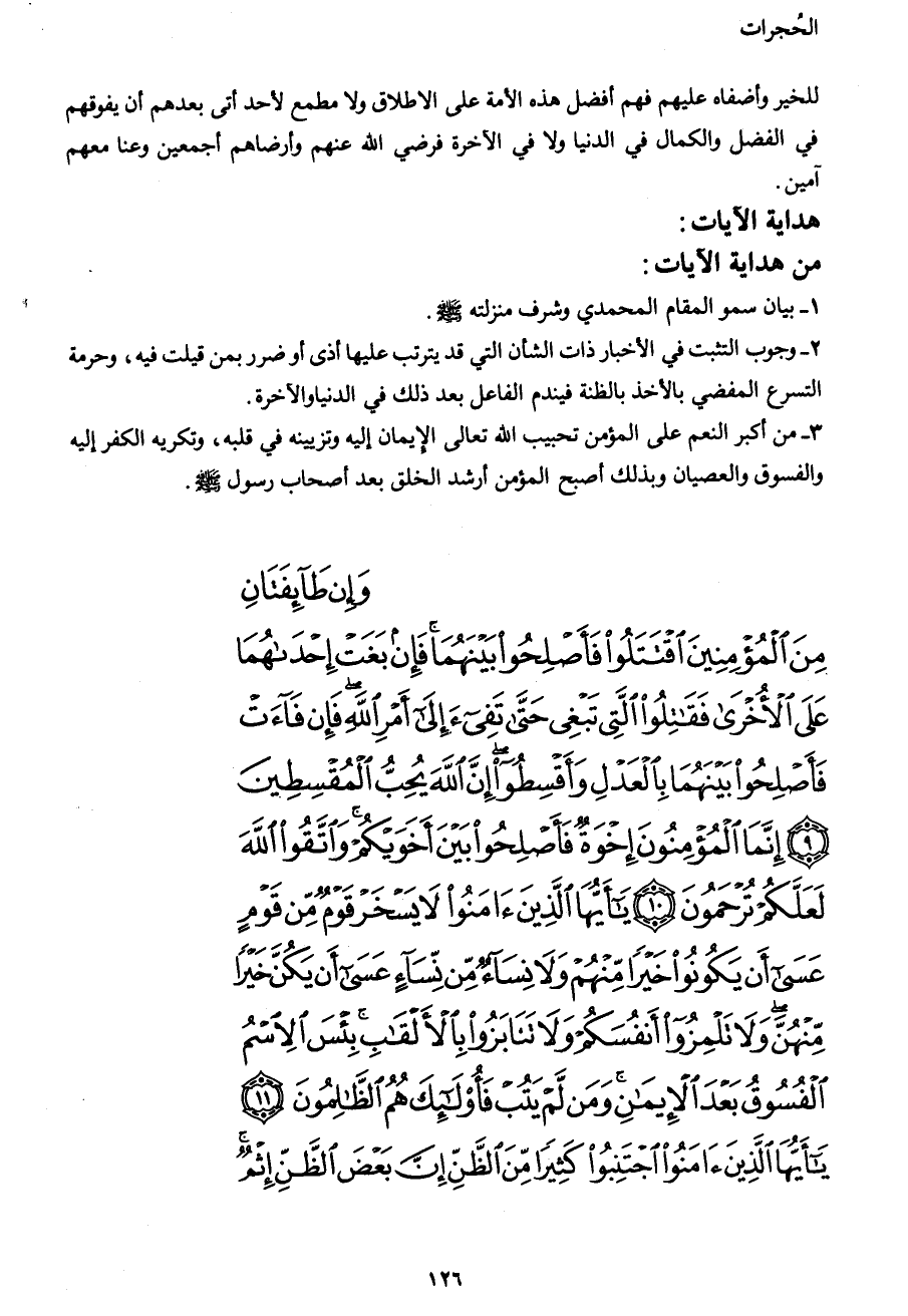وَإِنْ طَائِفَتَانِ مِنَ الْمُؤْمِنِينَ اقْتَتَلُوا فَأَصْلِحُوا بَيْنَهُمَا فَإِنْ بَغَتْ إِحْدَاهُمَا عَلَى الْأُخْرَى فَقَاتِلُوا الَّتِي تَبْغِي حَتَّى تَفِيءَ إِلَى أَمْرِ اللهِ فَإِنْ فَاءَتْ فَأَصْلِحُوا بَيْنَهُمَا بِالْعَدْلِ وَأَقْسِطُوا إِنَّ اللهَ يُحِبُّ الْمُقْسِطِينَ (9) إِنَّمَا الْمُؤْمِنُونَ إِخْوَةٌ فَأَصْلِحُوا بَيْنَ أَخَوَيْكُمْ وَاتَّقُوا اللهَ لَعَلَّكُمْ تُرْحَمُونَ (10) يَا أَيُّهَا الَّذِينَ آمَنُوا لا يَسْخَرْ قَوْمٌ مِنْ قَوْمٍ عَسَى أَنْ يَكُونُوا خَيْراً مِنْهُمْ وَلا نِسَاءٌ مِنْ نِسَاءٍ عَسَى أَنْ يَكُنَّ خَيْراً مِنْهُنَّ وَلا تَلْمِزُوا أَنْفُسَكُمْ وَلا تَنَابَزُوا بِالأَلْقَابِ بِئْسَ الِاسْمُ الْفُسُوقُ بَعْدَ الْأِيمَانِ وَمَنْ لَمْ يَتُبْ فَأُولَئِكَ هُمُ الظَّالِمُونَ (11) يَا أَيُّهَا الَّذِينَ آمَنُوا اجْتَنِبُوا كَثِيراً مِنَ الظَّنِّ إِنَّ بَعْضَ الظَّنِّ إِثْمٌ