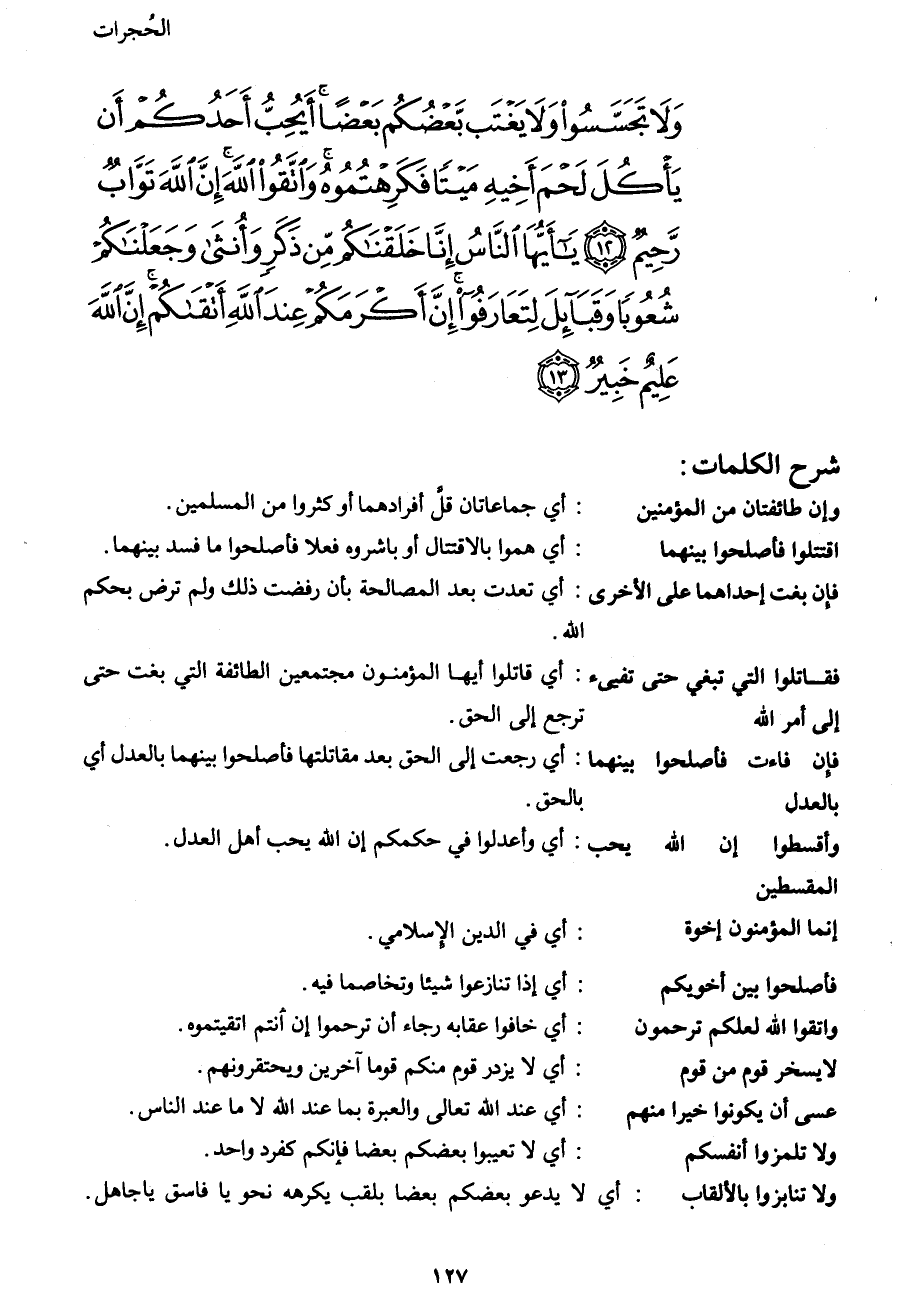 وَلا تَجَسَّسُوا وَلا يَغْتَبْ بَعْضُكُمْ بَعْضاً أَيُحِبُّ أَحَدُكُمْ أَنْ يَأْكُلَ لَحْمَ أَخِيهِ مَيْتاً فَكَرِهْتُمُوهُ وَاتَّقُوا اللهَ إِنَّ اللهَ تَوَّابٌ رَحِيمٌ (12) يَا أَيُّهَا النَّاسُ إِنَّا خَلَقْنَاكُمْ مِنْ ذَكَرٍ وَأُنْثَى وَجَعَلْنَاكُمْ شُعُوباً وَقَبَائِلَ لِتَعَارَفُوا إِنَّ أَكْرَمَكُمْ عِنْدَ اللهِ أَتْقَاكُمْ إِنَّ اللهَ عَلِيمٌ خَبِيرٌ (13)
