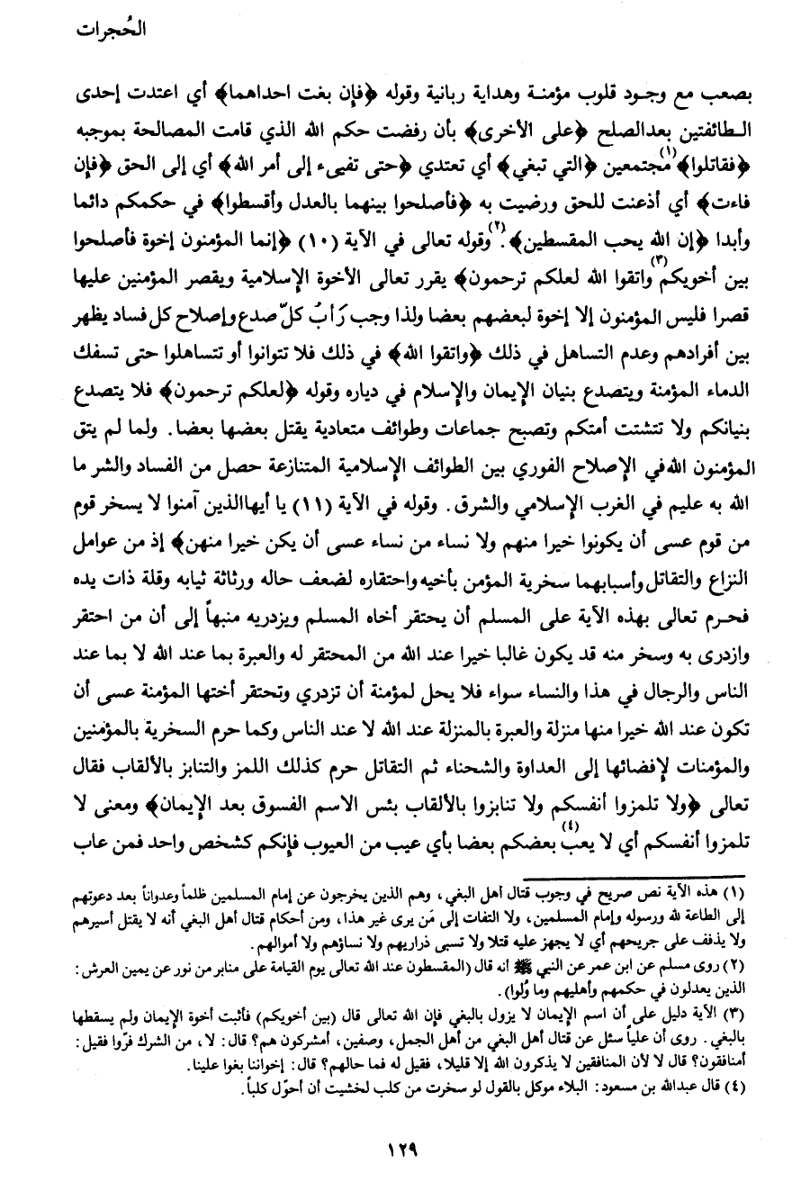 {عَلى الْأُخْرَى} بأن رفضت حكم الله الذي قامت المصالحة بموجبه {فَقَاتِلُو} 1 مجتمعين {الَّتِي تَبْغِي} أي تعتدي {حَتَّى تَفِيءَ إِلَى أَمْرِ اللهِ} أي إلى الحق {فَإِنْ فَاءَتْ} أي أذعنت للحق ورضيت به {فَأَصْلِحُوا بَيْنَهُمَا بِالْعَدْلِ وَأَقْسِطُوا} في حكمكم دائما وأبدا {إِنَّ اللهَ يُحِبُّ الْمُقْسِطِينَ} 2. وقوله تعالى في الآية (10) {إِنَّمَا الْمُؤْمِنُونَ إِخْوَةٌ فَأَصْلِحُوا بَيْنَ أَخَوَيْكُمْ3 وَاتَّقُوا اللهَ لَعَلَّكُمْ تُرْحَمُونَ} يقرر تعالى الأخوة الإسلامية ويقصر المؤمنين عليها قصرا فليس المؤمنون إلا أخوة لبعضهم بعضا ولذا وجب رأب كل صدع وإصلاح كل فاسد يظهر بين أفرادهم وعدم التساهل في ذلك {وَاتَّقُوا اللهَ} في ذلك فلا تتوانوا أو تتساهلوا حتى تسفك الدماء المؤمنة ويتصدع بنيان الإيمان والإسلام في دياره وقوله {لَعَلَّكُمْ تُرْحَمُونَ} فلا يتصدع بنيانكم ولا تتشتت أمتكم وتصبح جماعات وطوائف متعادية يقتل بعضها بعضا. ولما لم يتق المؤمنون الله في الإصلاح الفوري بين الطوائف الإسلامية المتنازعة حصل من الفساد والشر ما الله به عليم في الغرب الإسلامي والشرق. وقوله في الآية (11) {يا أَيُّهَا الَّذِينَ آمَنُوا لا يَسْخَرْ قَوْمٌ مِنْ قَوْمٍ عَسَى أَنْ يَكُونُوا خَيْراً مِنْهُمْ وَلا نِسَاءٌ مِنْ نِسَاءٍ عَسَى أَنْ يَكُنَّ خَيْراً مِنْهُنَّ} إذ من عوامل النزاع والتقاتل وأسبابهما سخرية المؤمن بأخيه واحتقاره لضعف حاله ورثاثة ثيابه وقلة ذات يده فحرم تعالى بهذه الآية على المسلم أن يحتقر أخاه المسلم ويزدريه منبهاً إلى أن من احتقر وازدرى به وسخر منه قد يكون غالبا خيرا عند الله من المحتقر له والعبرة بما عند الله لا بما عند الناس والرجال في هذا والنساء سواء فلا يحل لمؤمنة أن تزدري وتحتقر أختها المؤمنة عسى أن تكون عند الله خيرا منها والعبرة بالمنزلة عند الله لا عند الناس وكما حرم السخرية بالمؤمنين والمؤمنات لإفضائها إلى العداوة والشحناء ثم التقاتل حرم كذلك اللمز والتنابز بالألقاب فقال تعالى {وَلا تَلْمِزُوا أَنْفُسَكُمْ وَلا تَنَابَزُوا بِالأَلْقَابِ بِئْسَ الِاسْمُ الْفُسُوقُ بَعْدَ الْأِيمَانِ} ومعنى لا تلمزوا أنفسكم أي لا يعب4 بعضكم بعضا بأي عيب من العيوب فإنكم كشخص واحد فمن عاب