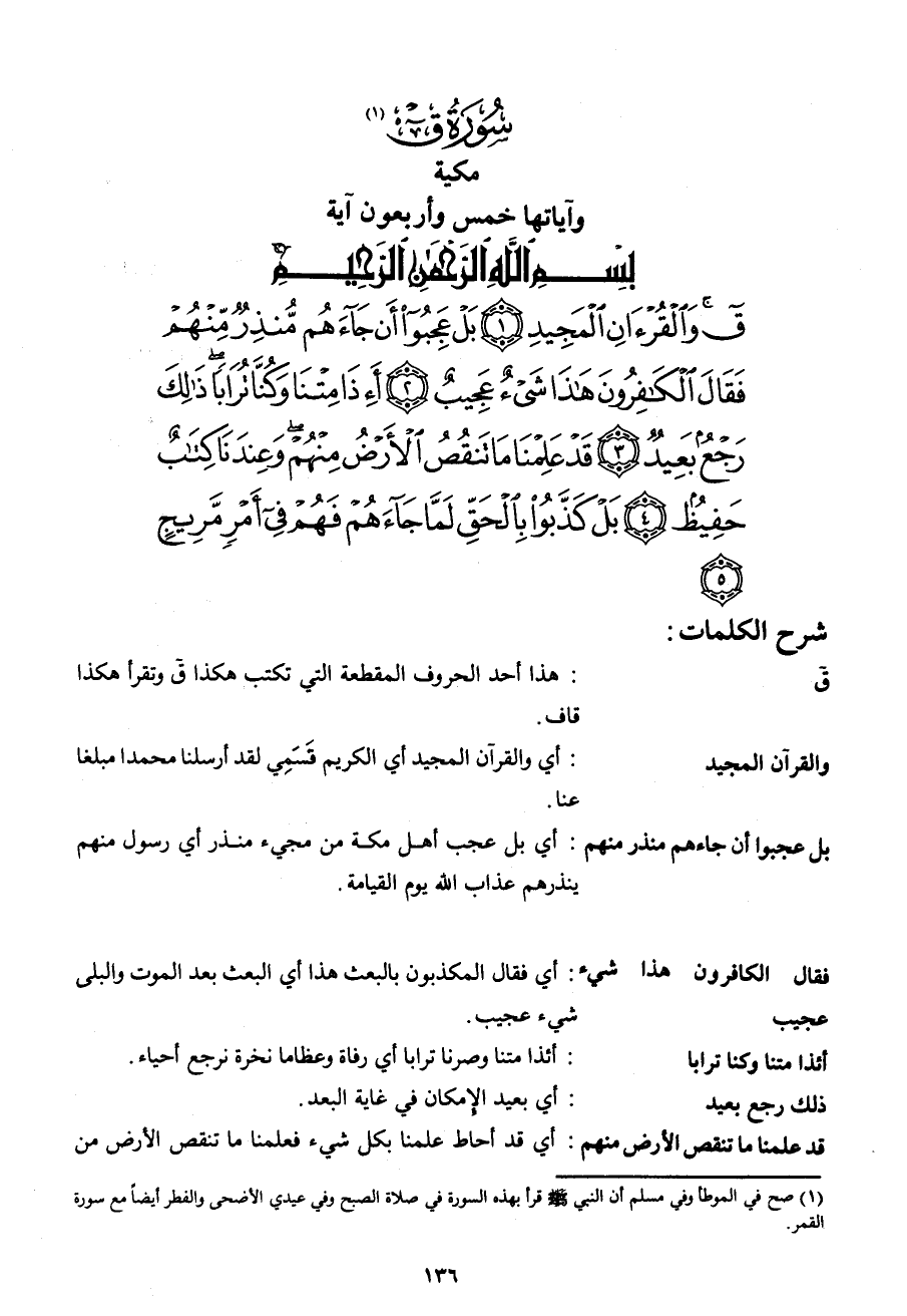 ق وَالْقُرْآنِ الْمَجِيدِ (1) بَلْ عَجِبُوا أَنْ جَاءَهُمْ مُنْذِرٌ مِنْهُمْ فَقَالَ الْكَافِرُونَ هَذَا شَيْءٌ عَجِيبٌ (2) أَإِذَا مِتْنَا وَكُنَّا تُرَاباً ذَلِكَ رَجْعٌ بَعِيدٌ (3) قَدْ عَلِمْنَا مَا تَنْقُصُ الْأَرْضُ مِنْهُمْ وَعِنْدَنَا كِتَابٌ حَفِيظٌ (4) بَلْ كَذَّبُوا بِالْحَقِّ لَمَّا جَاءَهُمْ فَهُمْ فِي أَمْرٍ مَرِيجٍ (5)