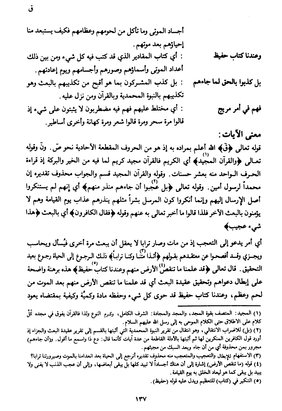 قوله تعالى {ق} الله أعلم بمراده به إذ هو من الحروف المقطعة الأحادية نحو ص. ون وقوله تعالى {وَالْقُرْآنِ الْمَجِيدِ1} أي الكريم فالقرآن مجيد كريم بما فيه من الخير والبركة إذ قراءة الحرف الواحد منه بعشر حسنات. وقوله والقرآن المجيد قسم والجواب محذوف تقديره إن محمداً لرسول أمين. وقوله تعالى {بَلْ عَجِبُوا2 أَنْ جَاءَهُمْ مُنْذِرٌ مِنْهُمْ} أي إنهم لم يستنكروا أصل الإرسال إليهم وإنما أنكروا كون المرسل بشراً مثلهم ينذرهم عذاب يوم القيامة وهم لا يؤمنون بالبعث الآخر فلذا قالوا ما أخبر تعالى به عنهم وقوله {فَقَالَ الْكَافِرُونَ} أي بالبعث {هَذَا شَيْءٌ عَجِيبٌ} أي أمر يدعو إلى التعجب إذ من مات وصار ترابا لا يعقل أن يبعث مرة أخرى فيسأل ويحاسب ويجزي وقد أفصحوا عن معتقدهم بقولهم {أَإِذَا مِتْنَا3 وَكُنَّا تُرَاباً} ذلك الرجوع إلى الحياة رجوع بعيد التحقيق. قال تعالى {قَدْ عَلِمْنَا مَا تَنْقُصُ4 الْأَرْضُ مِنْهُمْ وَعِنْدَنَا كِتَابٌ5 حَفِيظٌ} هذه برهنة واضحة على إبطال دعواهم وتحقيق عقيدة البعث أي قد علمنا ما تنقص الأرض منهم بعد الموت من لحم وعظم، وعندنا كتاب حفيظ قد حوى كل شيء وحفظه مادة وكمية وكيفية بمقتضاه يعود