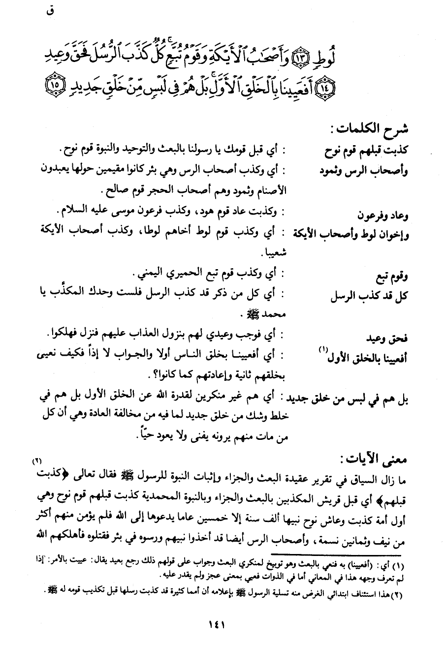 لُوطٍ (13) وَأَصْحَابُ الْأَيْكَةِ وَقَوْمُ تُبَّعٍ كُلٌّ كَذَّبَ الرُّسُلَ فَحَقَّ وَعِيدِ (14) أَفَعَيِينَا بِالْخَلْقِ الْأَوَّلِ بَلْ هُمْ فِي لَبْسٍ مِنْ خَلْقٍ جَدِيدٍ (15)