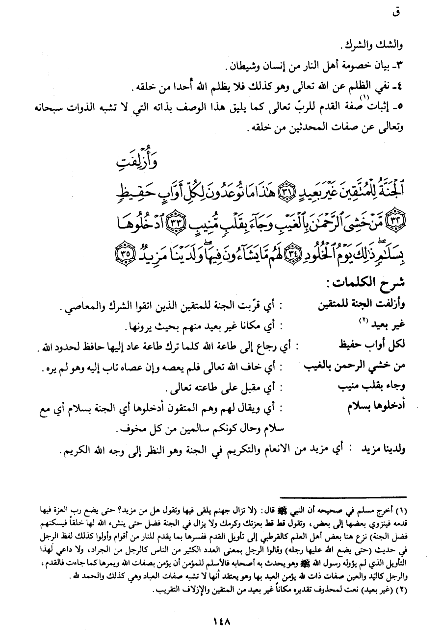 وَأُزْلِفَتِ الْجَنَّةُ لِلْمُتَّقِينَ غَيْرَ بَعِيدٍ (31) هَذَا مَا تُوعَدُونَ لِكُلِّ أَوَّابٍ حَفِيظٍ (32) مَنْ خَشِيَ الرَّحْمَنَ بِالْغَيْبِ وَجَاءَ بِقَلْبٍ مُنِيبٍ (33) ادْخُلُوهَا بِسَلامٍ ذَلِكَ يَوْمُ الْخُلُودِ (34) لَهُمْ مَا يَشَاءُونَ فِيهَا وَلَدَيْنَا مَزِيدٌ (35)