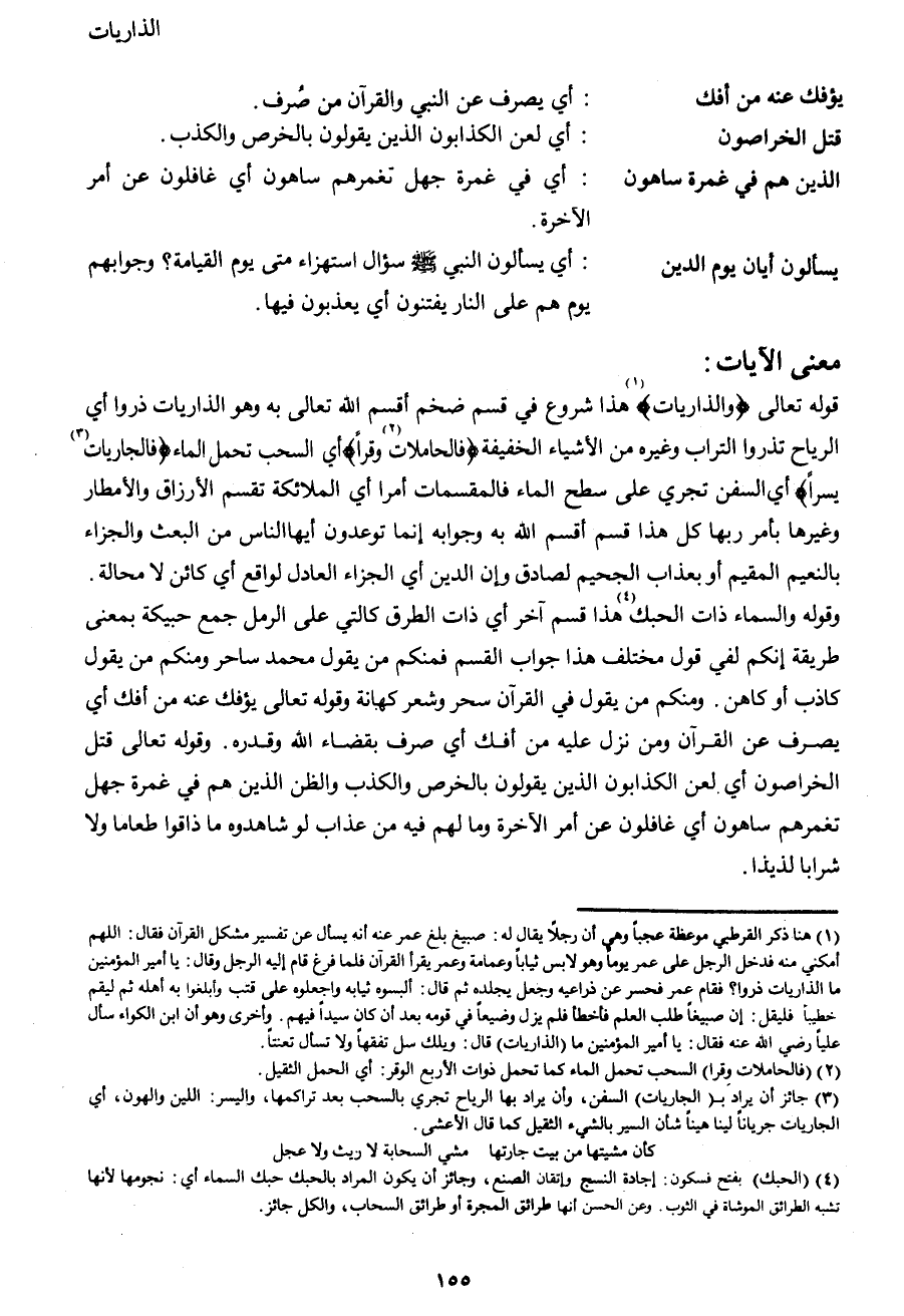 1 هنا ذكر القرطبي موعظة عجباً وهي أن رجلاً يقال له: صبيغ بلغ عمر عنه أن يسأل عن يسأل عن تفسير مشكل القرآن فقال: اللهم أمكني منه فدخل الرجل على عمر يوماً وهو لابس ثياباً وعمامة وعمر يقرأ القرآن فلما فرغ قام إليه الرجل وقال: يا أمير المؤمنين ما الذاريات ذروا؟ فقام عمر فحسر عن ذراعيه وجعل يجلده ثم قال: ألبسوه ثيابه واجعلوه على قتب وأبلغوا به أهله ثم ليقم خطيباً فليقل: إن صبيغاً طلب العلم فأخطأ فلم يزل وضيعاً في قومه بعد أن كان سيداً فيهم. وأخرى وهو أن ابن الكواء سأل علياً رضي اللع عنه فقال: يا أمير المؤمنين ما (الذاريات) قال: ويلك سل تفقهاً ولا تسأل تعنتاً.