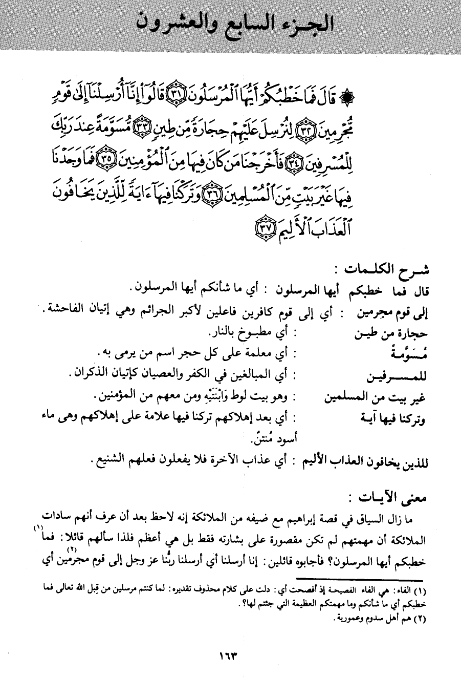 قَالَ فَمَا خَطْبُكُمْ أَيُّهَا الْمُرْسَلُونَ (31) قَالُوا إِنَّا أُرْسِلْنَا إِلَى قَوْمٍ مُجْرِمِينَ (32) لِنُرْسِلَ عَلَيْهِمْ حِجَارَةً مِنْ طِينٍ (33) مُسَوَّمَةً عِنْدَ رَبِّكَ لِلْمُسْرِفِينَ (34) فَأَخْرَجْنَا مَنْ كَانَ فِيهَا مِنَ الْمُؤْمِنِينَ (35) فَمَا وَجَدْنَا فِيهَا غَيْرَ بَيْتٍ مِنَ الْمُسْلِمِينَ (36) وَتَرَكْنَا فِيهَا آيَةً لِلَّذِينَ يَخَافُونَ الْعَذَابَ الأَلِيمَ (37)