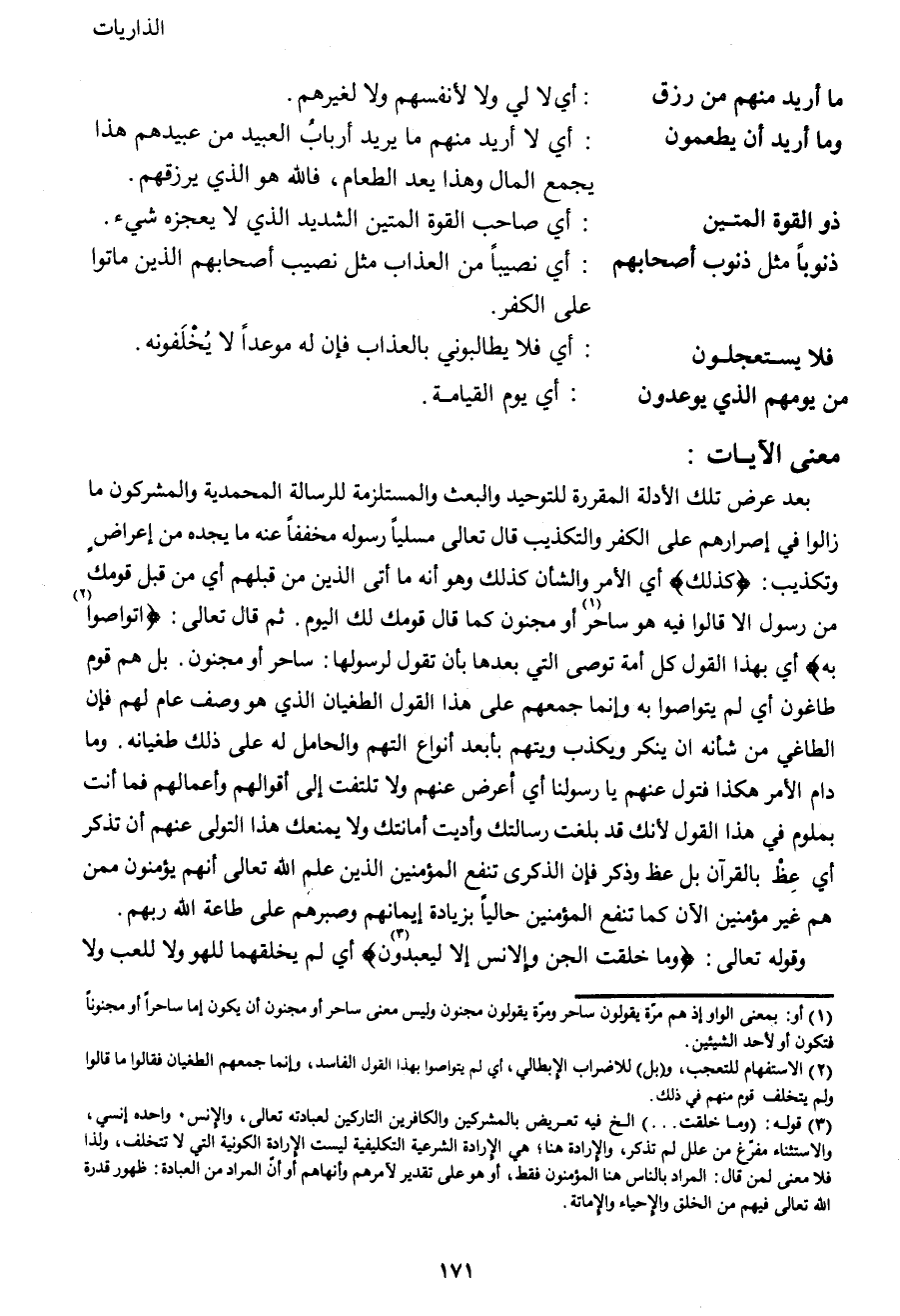 3 قوله: {وَمَا خَلَقْتُ ... } الخ فيه تعريض للمشركين والكافرين التاركين لعبادته تعالى، والإنس واحده إنسي، والاستثناء مفرغ من علل لم تذكر، والإرادة هنا؛ هي الإرادة الشرعية التكليفية ليست الإرادة الكونية التي لا تتخلف، ولذا فلا معنى لمن قال: المراد بالناس هنا المؤمنون فقط، أو هو على تقدير لآمرهم وأنهاهم أو أن المراد من العبادة: ظهور قدرة الله تعالى فيهم من الخلق والإحياء والإماتة.