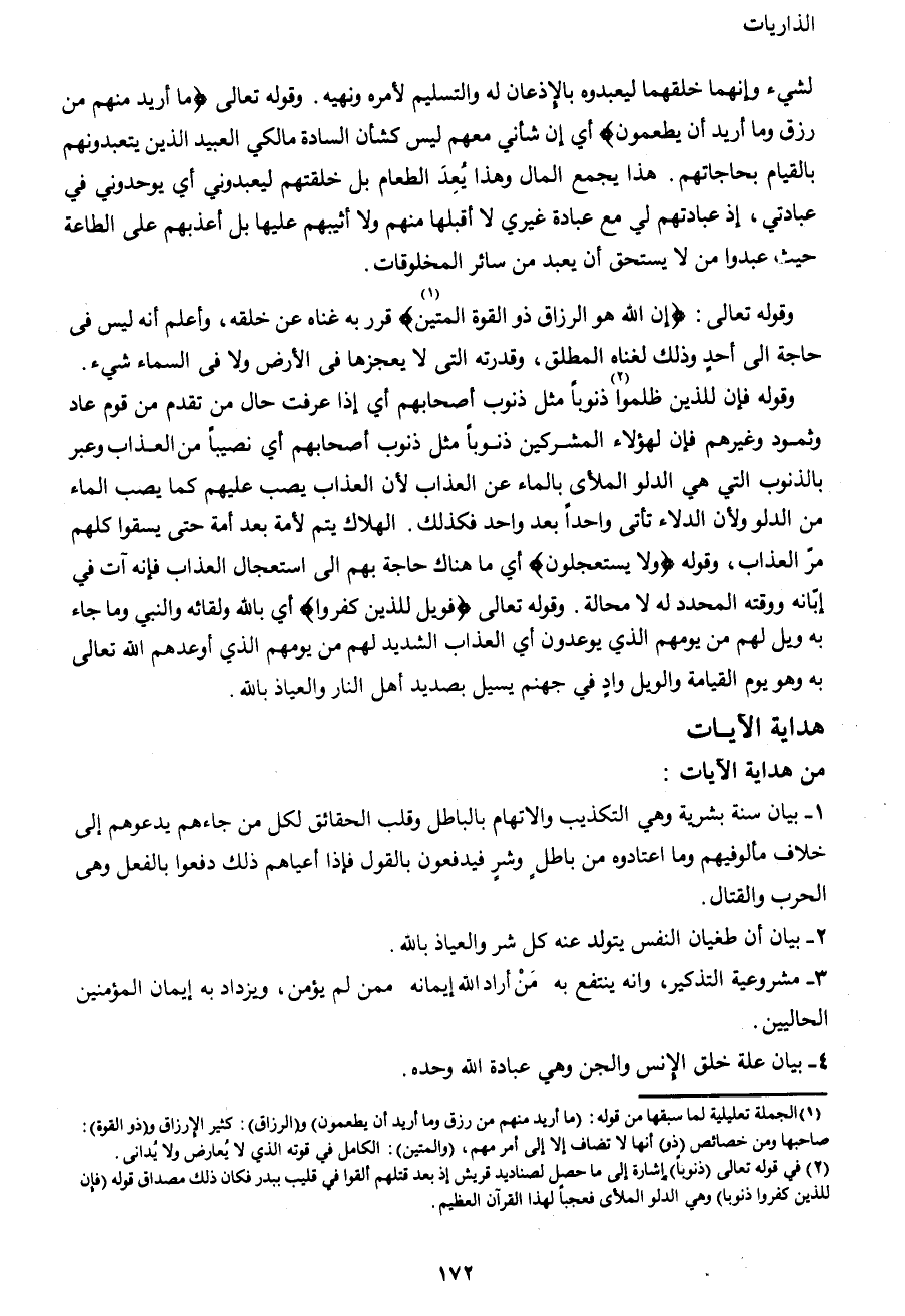 قوله تعالى {إِنَّ اللهَ هُوَ الرَّزَّاقُ ذُو الْقُوَّةِ الْمَتِينُ1} قرر به غناه عن خلقه، وأعلم أنه ليس في حاجة إلى أحدٍ وذلك لغناه المطلق، وقدرته التي لا يعجزها في الأرض ولا في السماء شيء. وقوله فإن للذين ظلموا2 ذنوباً مثل ذنوب أصحابهم أي إذا عرفت حال من تقدم من قوم عاد وثمود وغيرهم فإن لهؤلاء المشركين ذنوباً مثل ذنوب أصحابهم أي نصيباً من العذاب وعبر بالذنوب التي هي الدلو الملأى بالماء عن العذاب لأن العذاب يصب عليهم كما يصب الماء من الدلو ولأن الدلاء تأتى واحدا بعد واحد فكذلك. الهلاك يتم لأمة بعد أمة حتى يسقوا كلهم مر العذاب, وقوله {فَلا يَسْتَعْجِلُونِ} أي ما هناك حاجة بهم الى استعجال العذاب فإنه آت في إبانه ووقته المحدد له لا محالة. وقوله تعالى {فَوَيْلٌ لِلَّذِينَ كَفَرُوا} أي بالله ولقائه والنبي وما جاء به ويل لهم من يومهم الذي يوعدون أي العذاب الشديد لهم من يومهم الذي أوعدهم الله تعالى به وهو يوم القيامة والويل وادٍ في جهنم يسيل بصديد أهل النار والعياذ بالله.