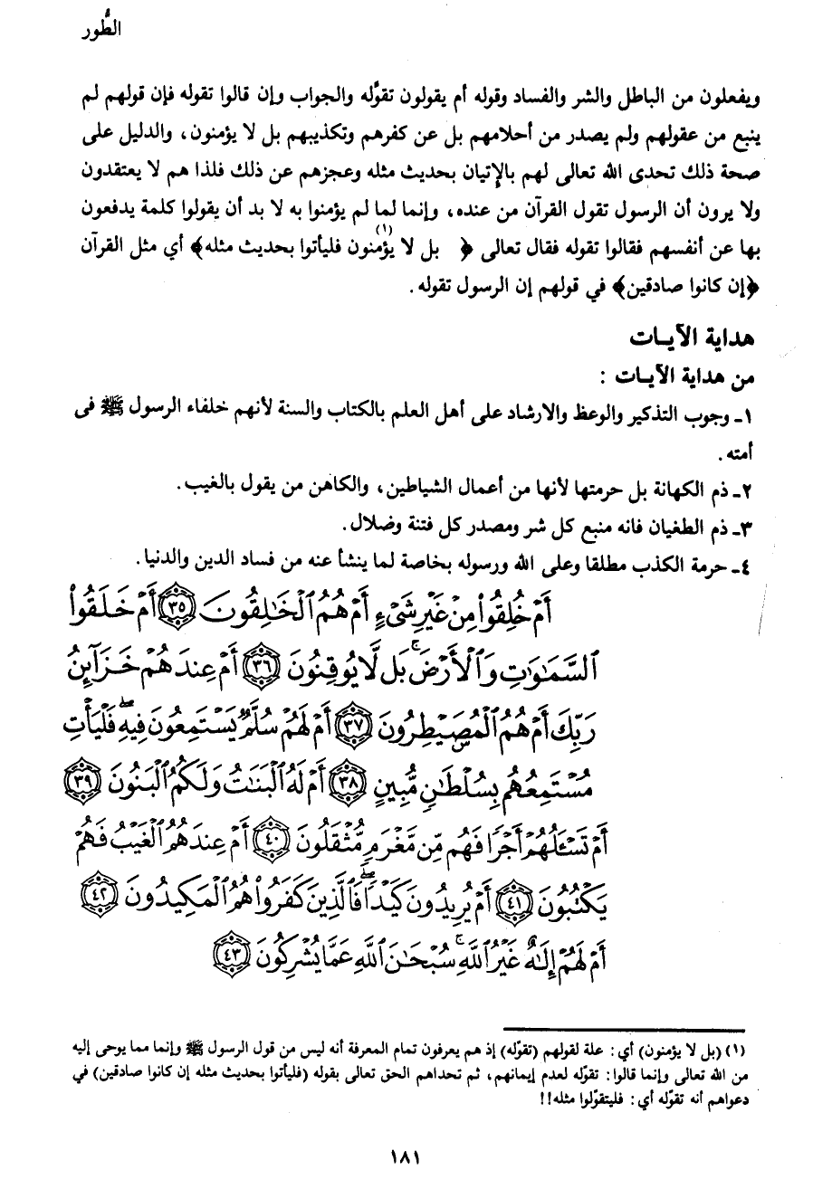 أَمْ خُلِقُوا مِنْ غَيْرِ شَيْءٍ أَمْ هُمُ الْخَالِقُونَ (35) أَمْ خَلَقُوا السَّمَاوَاتِ وَالْأَرْضَ بَلْ لا يُوقِنُونَ (36) أَمْ عِنْدَهُمْ خَزَائِنُ رَبِّكَ أَمْ هُمُ الْمُصَيْطِرُونَ (37) أَمْ لَهُمْ سُلَّمٌ يَسْتَمِعُونَ فِيهِ فَلْيَأْتِ مُسْتَمِعُهُمْ بِسُلْطَانٍ مُبِينٍ (38) أَمْ لَهُ الْبَنَاتُ وَلَكُمُ الْبَنُونَ (39) أَمْ تَسْأَلُهُمْ أَجْراً فَهُمْ مِنْ مَغْرَمٍ مُثْقَلُونَ (40) أَمْ عِنْدَهُمُ الْغَيْبُ فَهُمْ يَكْتُبُونَ (41) أَمْ يُرِيدُونَ كَيْداً فَالَّذِينَ كَفَرُوا هُمُ الْمَكِيدُونَ (42) أَمْ لَهُمْ إِلَهٌ غَيْرُ اللهِ سُبْحَانَ اللهِ عَمَّا يُشْرِكُونَ (43)