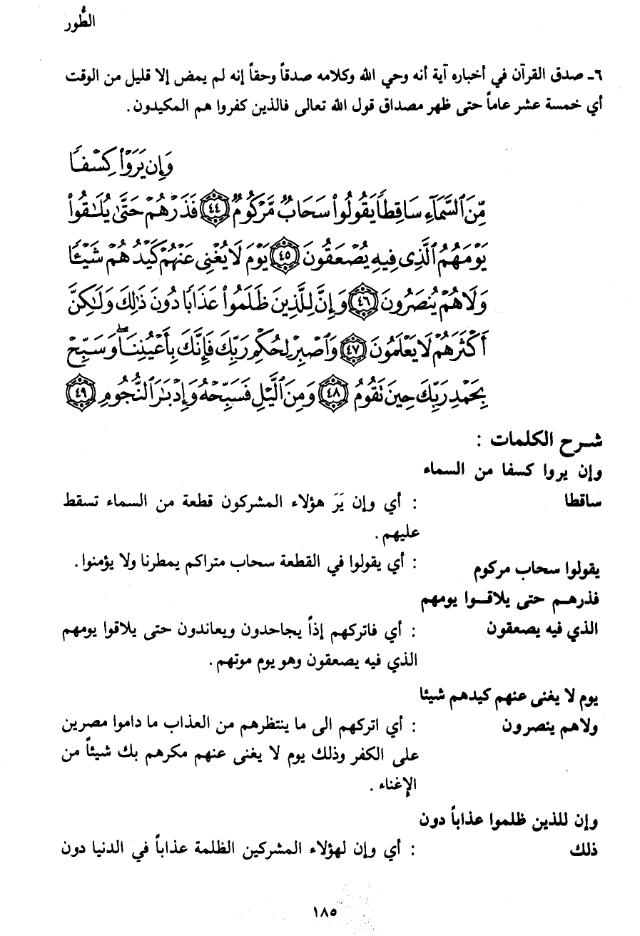 يَوْمَ لا يُغْنِي عَنْهُمْ كَيْدُهُمْ شَيْئاً وَلا هُمْ يُنْصَرُونَ (46) وَإِنَّ لِلَّذِينَ ظَلَمُوا عَذَاباً دُونَ ذَلِكَ وَلَكِنَّ أَكْثَرَهُمْ لا يَعْلَمُونَ (47) وَاصْبِرْ لِحُكْمِ رَبِّكَ فَإِنَّكَ بِأَعْيُنِنَا وَسَبِّحْ بِحَمْدِ رَبِّكَ حِينَ تَقُومُ (48) وَمِنَ اللَّيْلِ فَسَبِّحْهُ وَإِدْبَارَ النُّجُومِ (49)