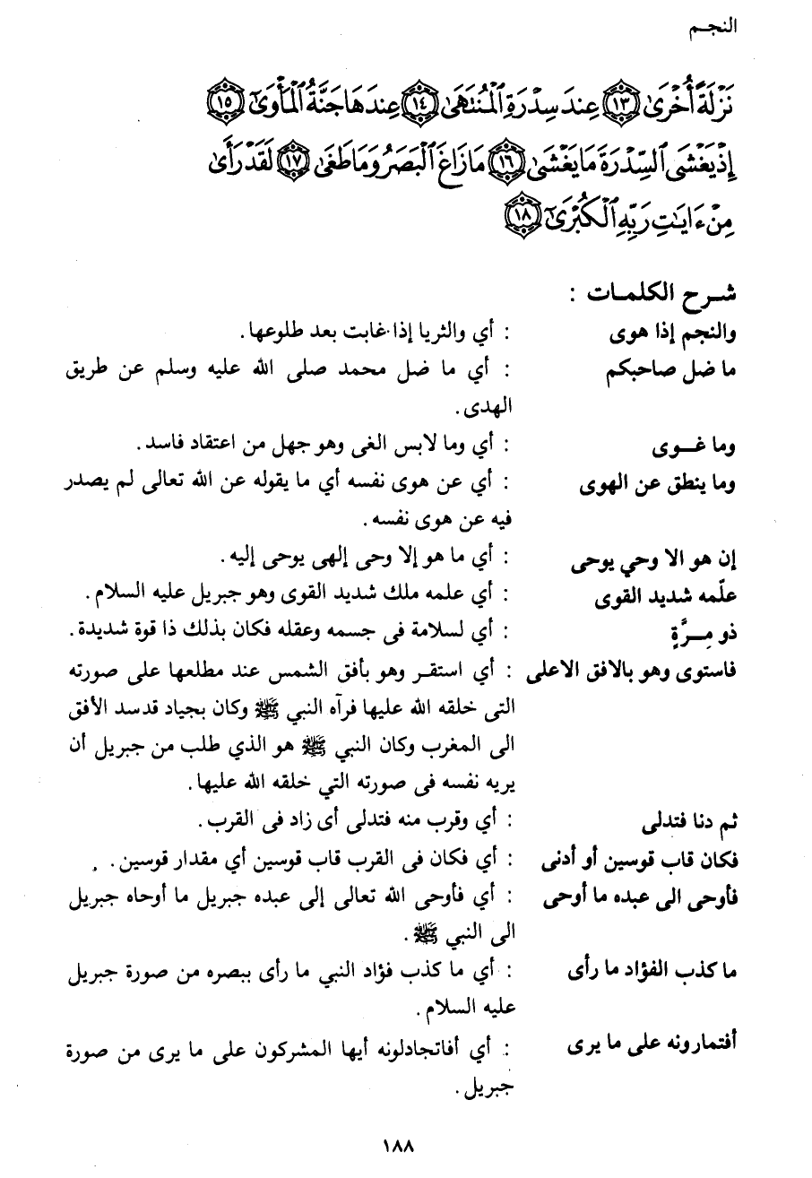 نَزْلَةً أُخْرَى (13) عِنْدَ سِدْرَةِ الْمُنْتَهَى (14) عِنْدَهَا جَنَّةُ الْمَأْوَى (15) إِذْ يَغْشَى السِّدْرَةَ مَا يَغْشَى (16) مَا زَاغَ الْبَصَرُ وَمَا طَغَى (17) لَقَدْ رَأَى مِنْ آيَاتِ رَبِّهِ الْكُبْرَى (18)