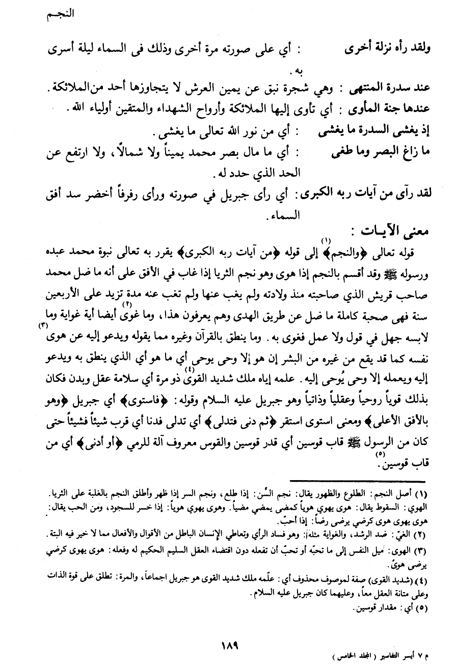 قوله تعالى {وَالنَّجْمِ1} إلى قوله {مِنْ آيَاتِ رَبِّهِ الْكُبْرَى} يقرر به تعالى نبوة محمد عبده ورسوله صَلَّى اللهُ عَلَيْهِ وَسَلَّمَ وقد أقسم بالنجم إذا هوى وهو نجم الثريا إذا غاب في الأفق على أنه ما ضل محمد صاحب قريش الذي صاحبته منذ ولادته ولم يغب عنها ولم تغب عنه مدة تزيد على الأربعين سنة فهي صحبة كاملة ما ضل عن طريق الهدى وهم يعرفون هذا، وما غوى2 أيضا أية رواية وما لابسه جهل في قول ولا عمل فغوى به. وما ينطق بالقرآن وغيره مما يقوله ويدعوا إليه عن هوى3 نفسه كما قد يقع من غيره من البشر إن هو إلا وحي يوحى أي ما هو أي الذي ينطق به ويدعوا إله ويعمله إلا وحي يوحى إليه. علمه إياه ملك شديد القوى4 ذو مرة أي سلامة عقل وبدن وكان بذلك قوياً روحياً وعقلياً وذاتياً وهو جبريل عليه والسلام وقوله: {فَاسْتَوَى} أي جبريل {وهُوَ بِالْأُفُقِ الْأَعْلَى} ومعنى استوى استقر {ثُمَّ دَنَا فَتَدَلَّى} أي تدلى فدنا أي قرب شيئاً فشيئاً حتى كان من الرسول صَلَّى اللهُ عَلَيْهِ وَسَلَّمَ قاب قوسين أي قدر قوسين والقوس معروف آلة للرمي {أَوْ أَدْنَى} أي من قاب قوسين5.
