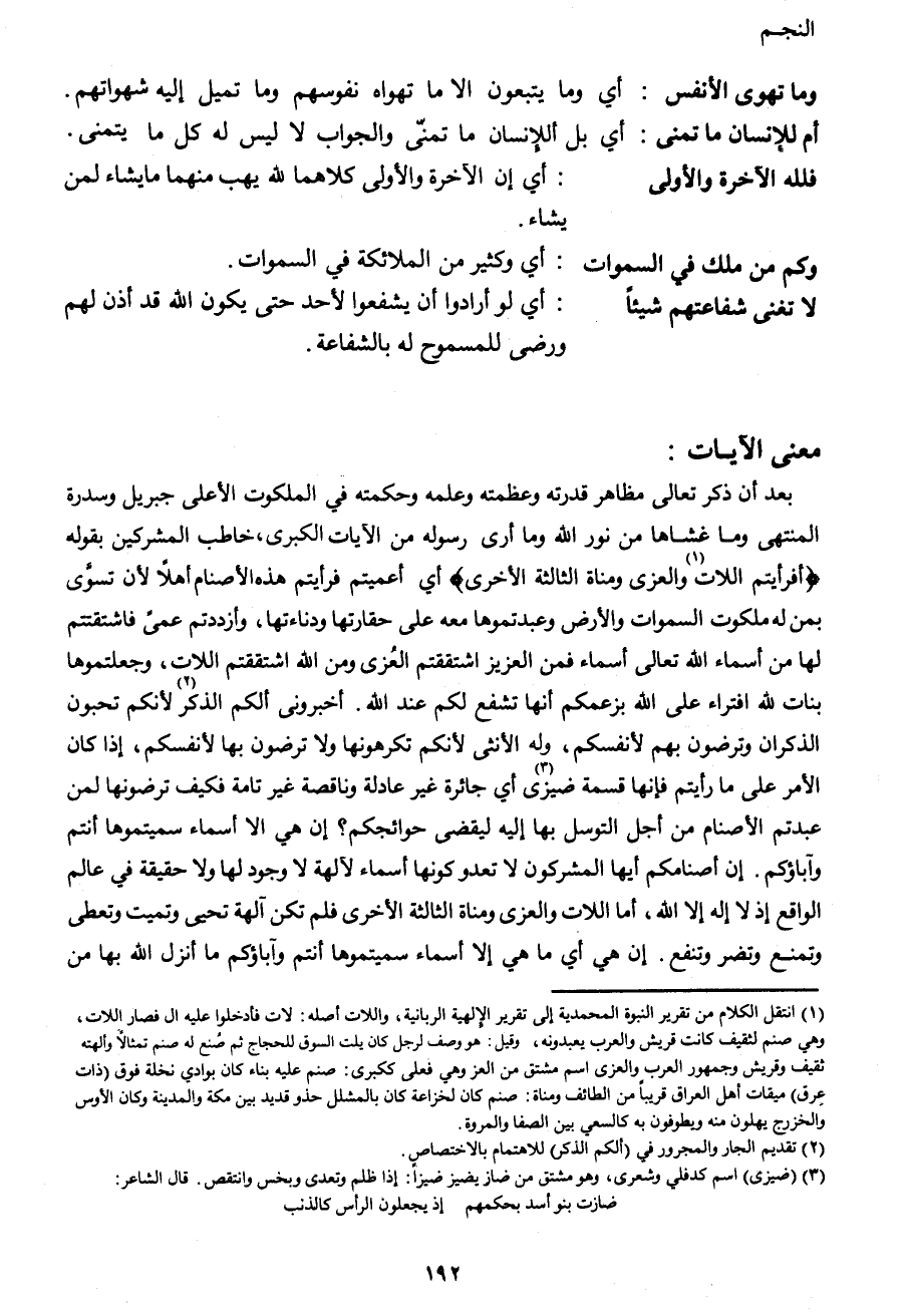 1 انتقل الكلام من تقرير النبوة المحمدية إلى تقرير الإلهية الربانية، واللات أصله: لات فأدخلوا عليه ال فصار اللات، وهي صنم لثقيف كانت قريش والعرب يعبدونه، وقيل: هو وصف لرجل كان يلت السوق للحجاج ثم صنع له صنم تمثالاً وألهته ثقيف وقريش وجمهور العرب والعزى اسم مشتق من العز وهي فعلى ككبرى: صنم عليه بناء كان بوادي نخلة فوق (ذات عرق) ميقات أهل العراق قريباً من الطائف ومناة: صنم كان لخزاعة كان بالمشلل حذو قديد بين مكة والمدينة وكان الأوس والخزرج يهلون منه ويطوفون به كالسعي بين الصفا والمروة.