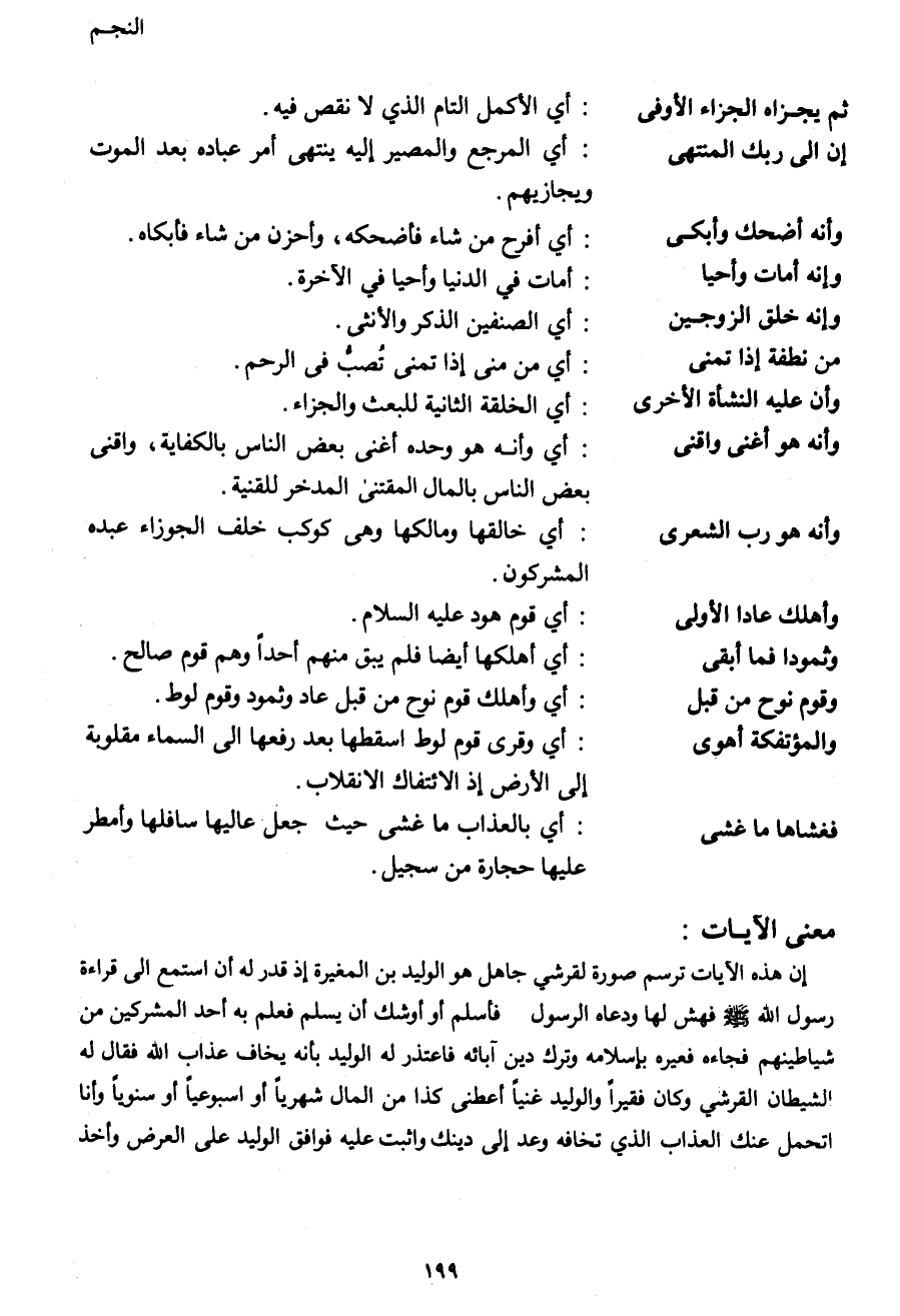 إن هذه الآيات ترسم صورة لقرشي جاهل هو الوليد بن المغيرة إذ قدر له أن استمع إلى قراءة رسول الله صَلَّى اللهُ عَلَيْهِ وَسَلَّمَ فهش لها ودعاه الرسول فأسلم أو أوشك أن يسلم فعلم به أحد المشركين من شياطينهم فجاءه فعيره بإسلامه وترك دين آبائه فاعتذر له الوليد بأنه يخاف عذاب الله فقال له الشيطان القرشي وكان فقيراً والوليد غنياً أعطني كذا من المال شهرياً أو أسبوعياً أو سنوياً وأنا أتحمل عنك العذاب الذي تخافه وعد إلى دينك واثبت عليه فوافق الوليد على العرض وأخذ